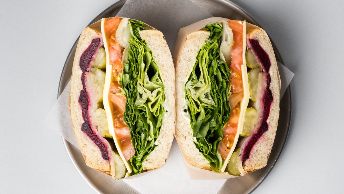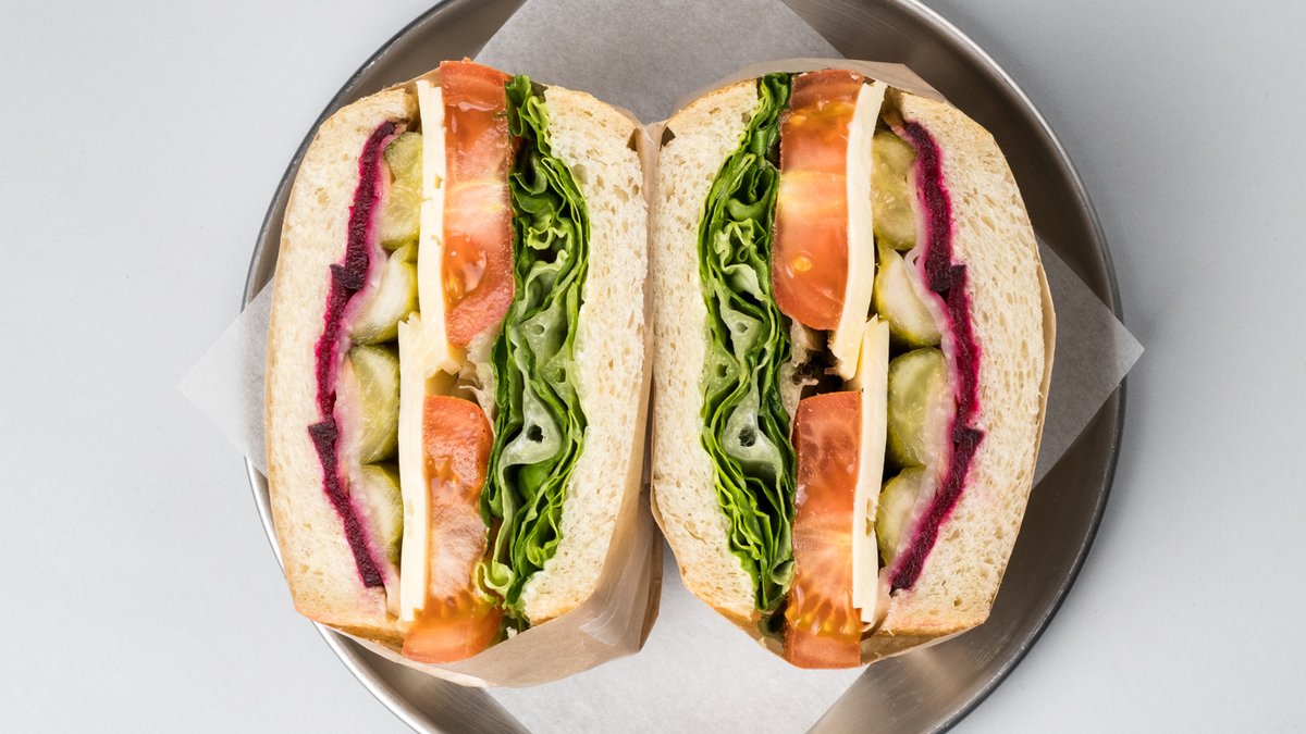 Vores ikoniske surdejs- & kartoffelbrød, røget rødbeder og knoldselleri charcuteri, vegansk ost, romainesalat, pickles, tomat & vegansk sennepsmayo.