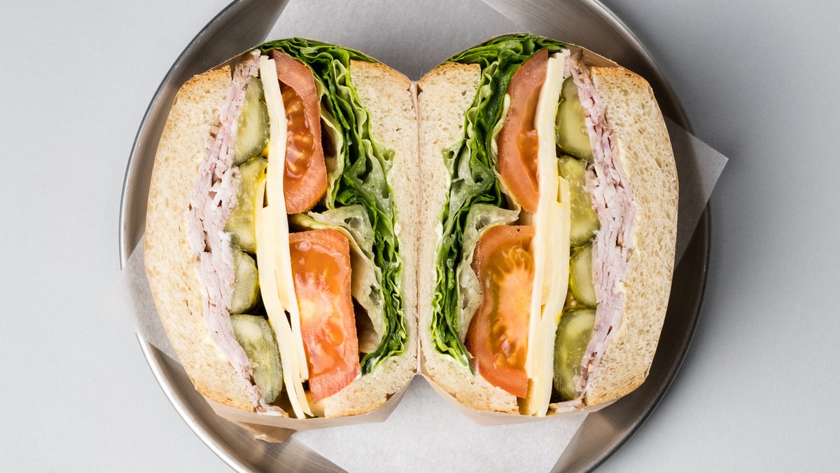 Vores ikoniske surdejs- & kartoffelbrød, hjemmelavet rosmarin- & fennikelskinke, glaseret røget skinke, Vesterhavsost, romainesalat, pickles, tomat & vores sennepsmayo.