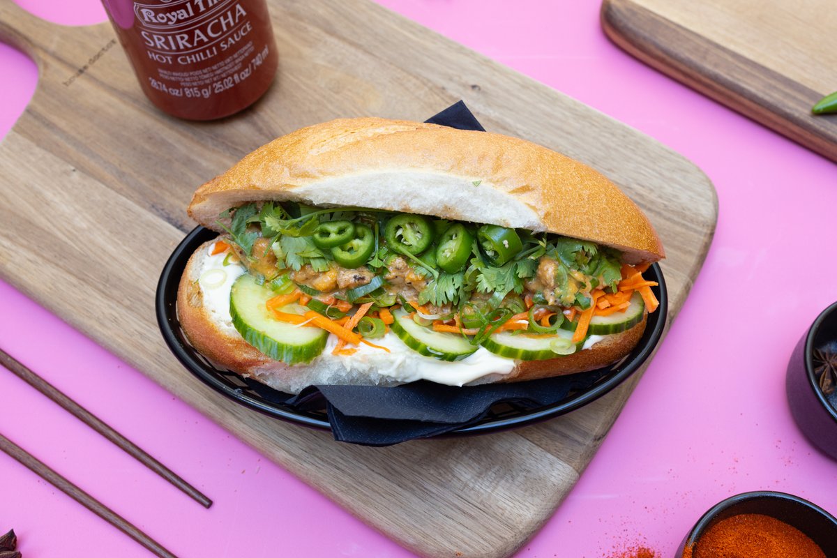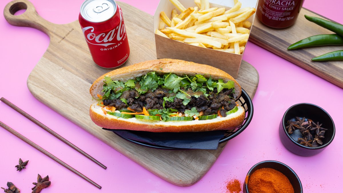 Citrongræs marineret flanksteak, hjemmebagt baguette, syltet gulerod & kinaradise, forårsløg, agurk, citronmarineret rødkål, aromatisk mayo og hjemmelavet sweet chili sauce. Toppet med peanuts.