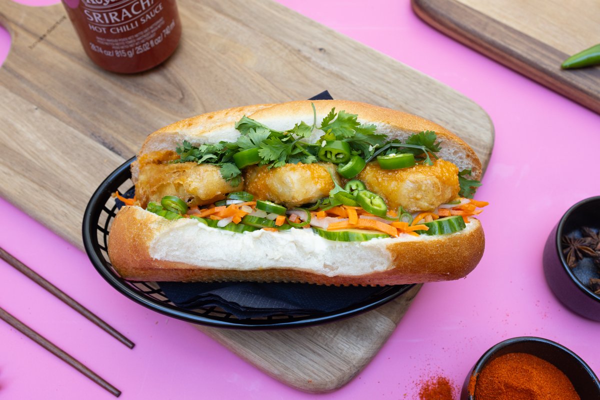 Langtids marineret crispy Pork Belly, hjemmebagt baguette, syltet gulerod & kinaradise, forårsløg, agurk, citronmarineret rødkål, aromatisk mayo, Banh Banh sauce og hjemmelavet sweet chili sauce. Toppet med peanuts.