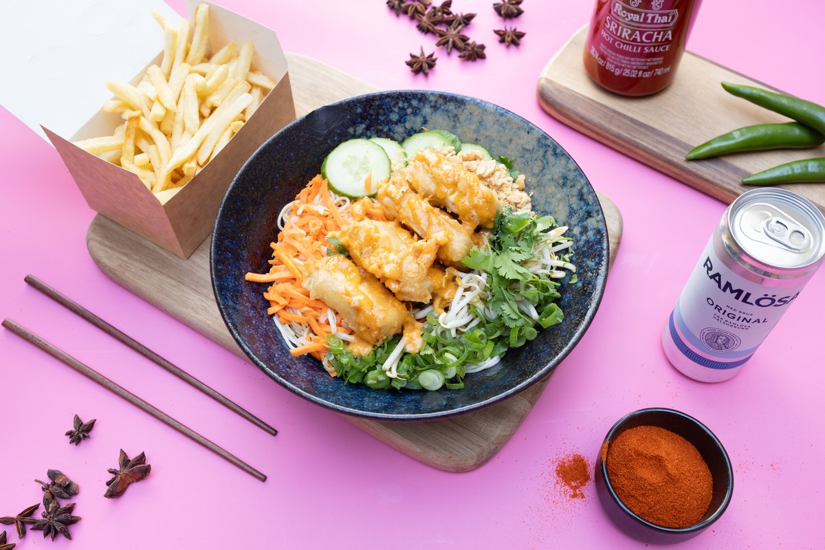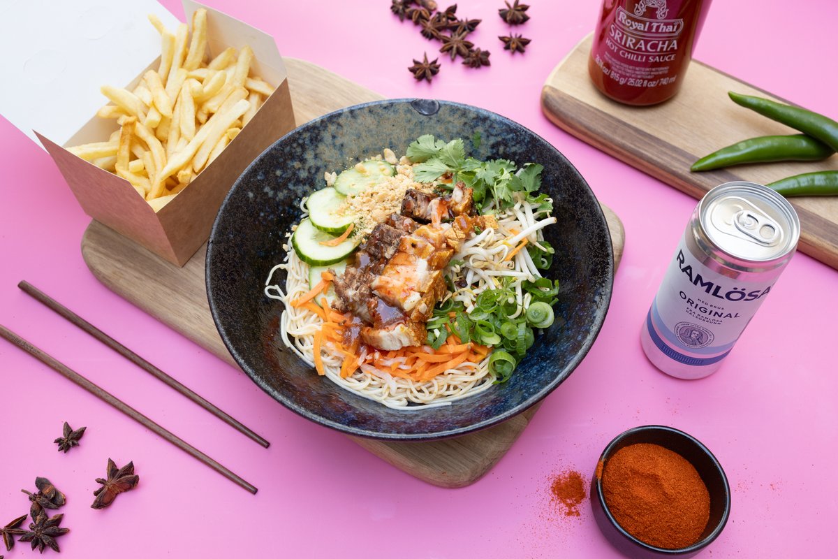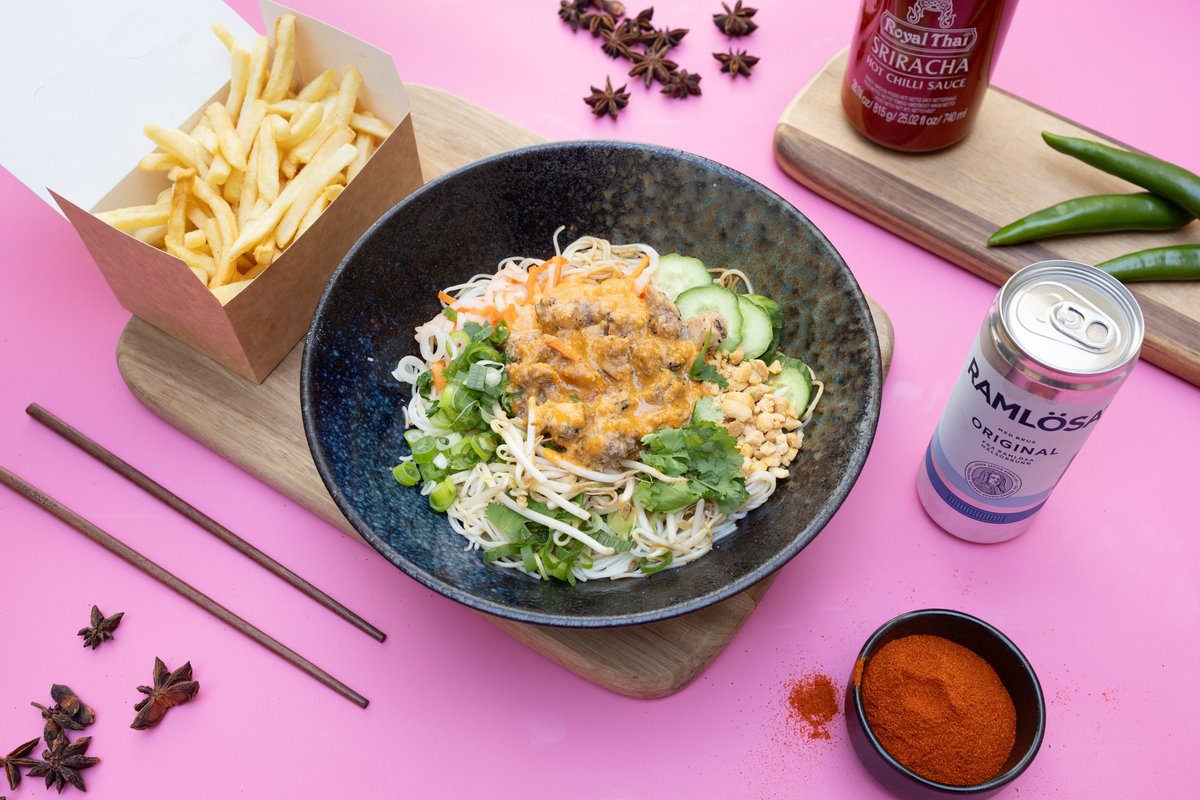 Langtids marineret crispy Pork Belly, risnudler med asiatisk vinaigrette, syltet gulerod & kinaradise, forårsløg, agurk, bønnespirer, citronmarineret rødkål og hjemmelavet sweet chili sauce. Toppet med peanuts. I en combo går du pommes frites og en sodavand (0,33l)!