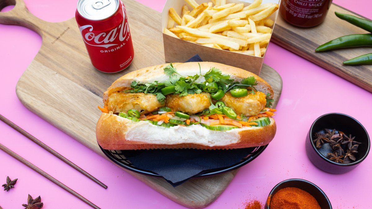 Char Siu marineret kyllingefilet, hjemmebagt baguette, syltet gulerod & kinaradise, forårsløg, agurk, citronmarineret rødkål, aromatisk mayo & satay dressing. Toppet med peanuts. I en combo får du pommes frites og sodavand (0,33l)!