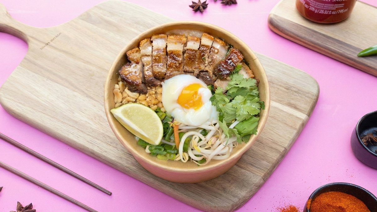 Varm aromatisk risgrød simret på grisefond og urter, toppet med sprød pork belly, 65 c sous-vide æg, forårsløg, peanuts, bønnespirer, koriander og lime.