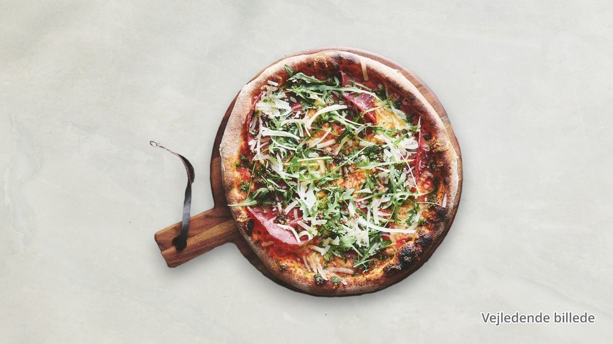 Tomat, ost, skinke, gorgonzola, champignon og oliven.
