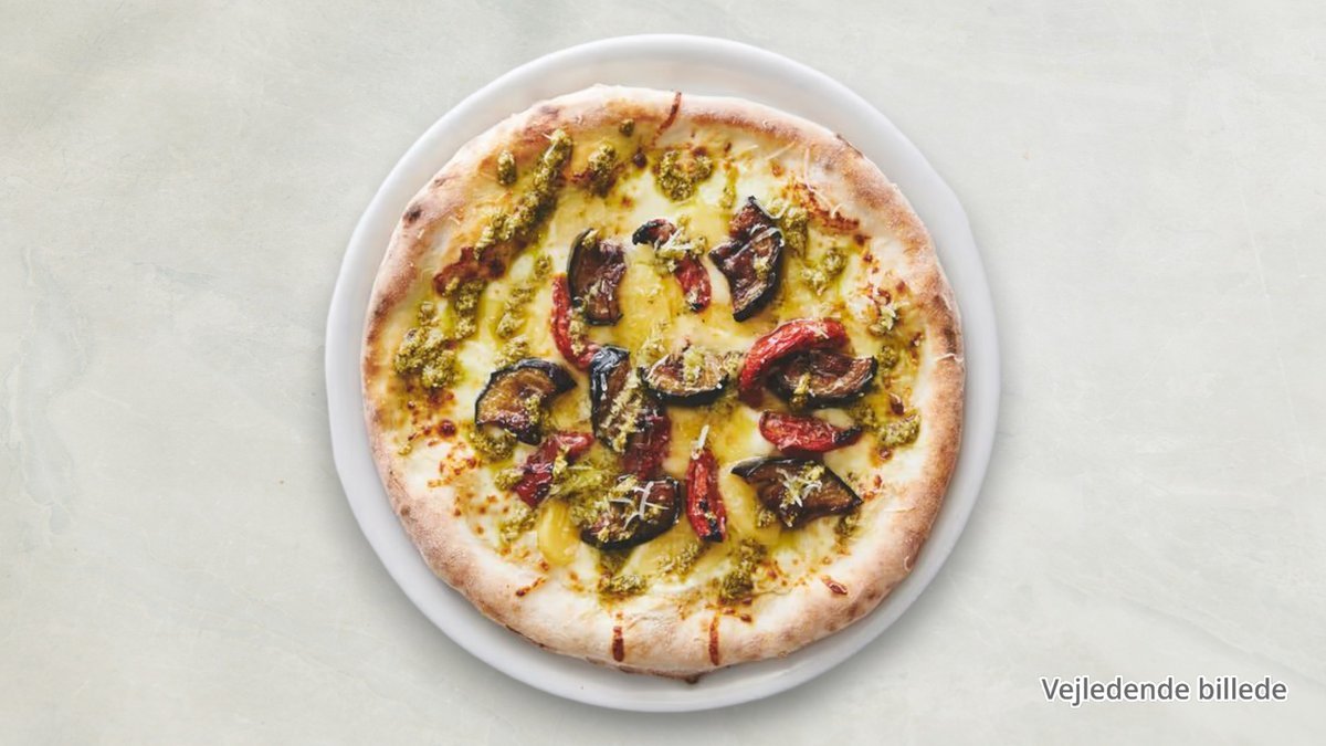 Mascarpone ost, grillede squash, mozzarella, cherry tomater og pesto.