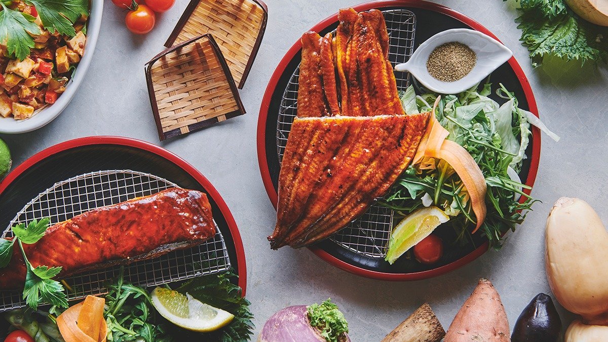 Japansk helstegt ål med barbecueglaze serveret med ris, misosuppe, salat, pickles og japansk kartoffelsalat.