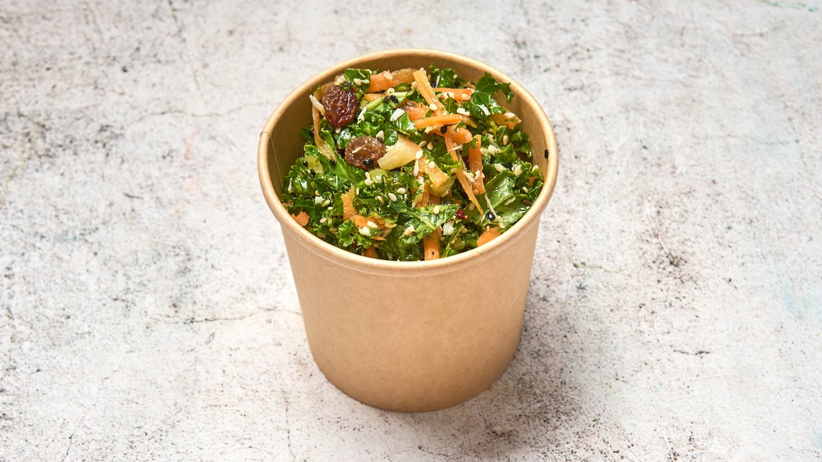 Grønkålssalat med frisk mynte, sesamfrø og tørrede berberisbær.