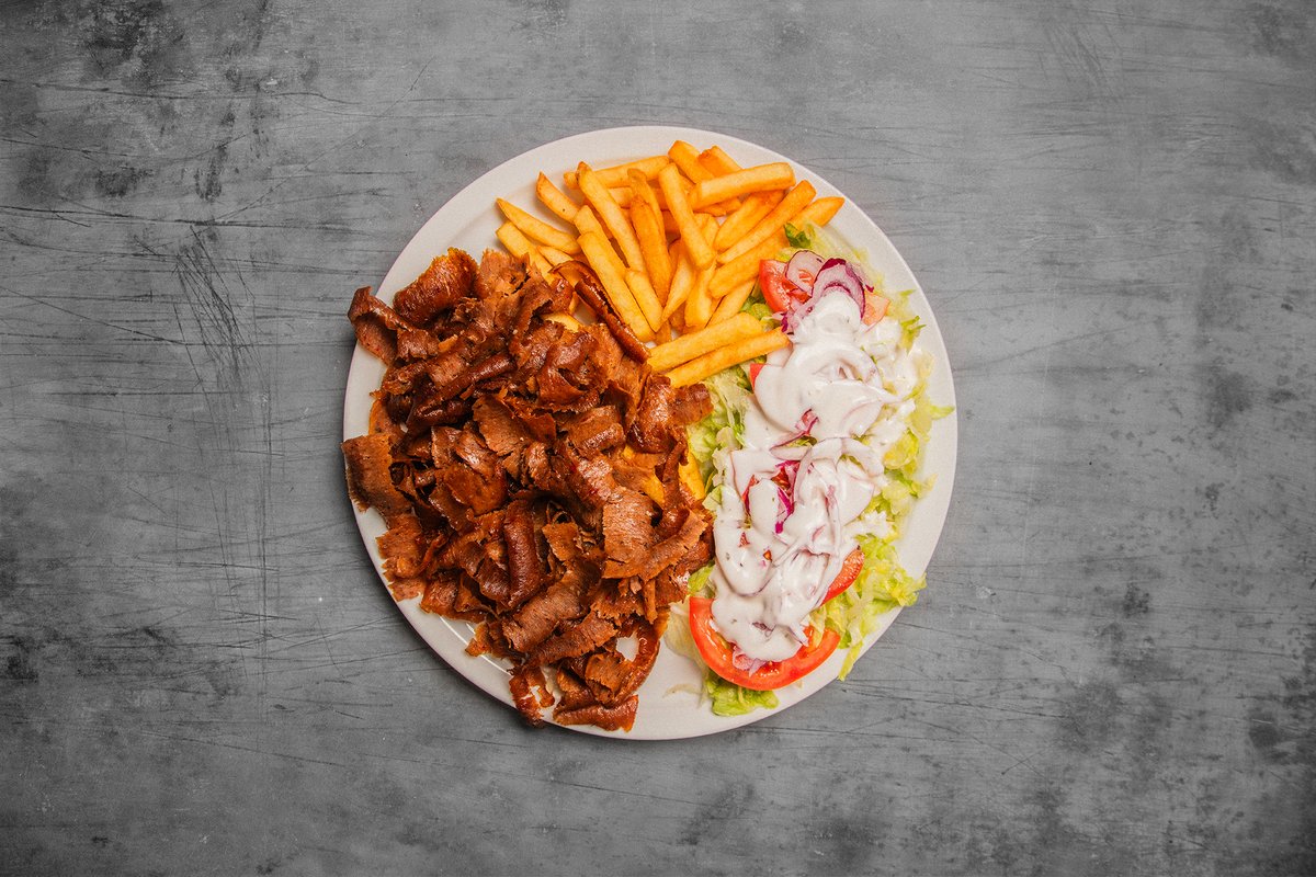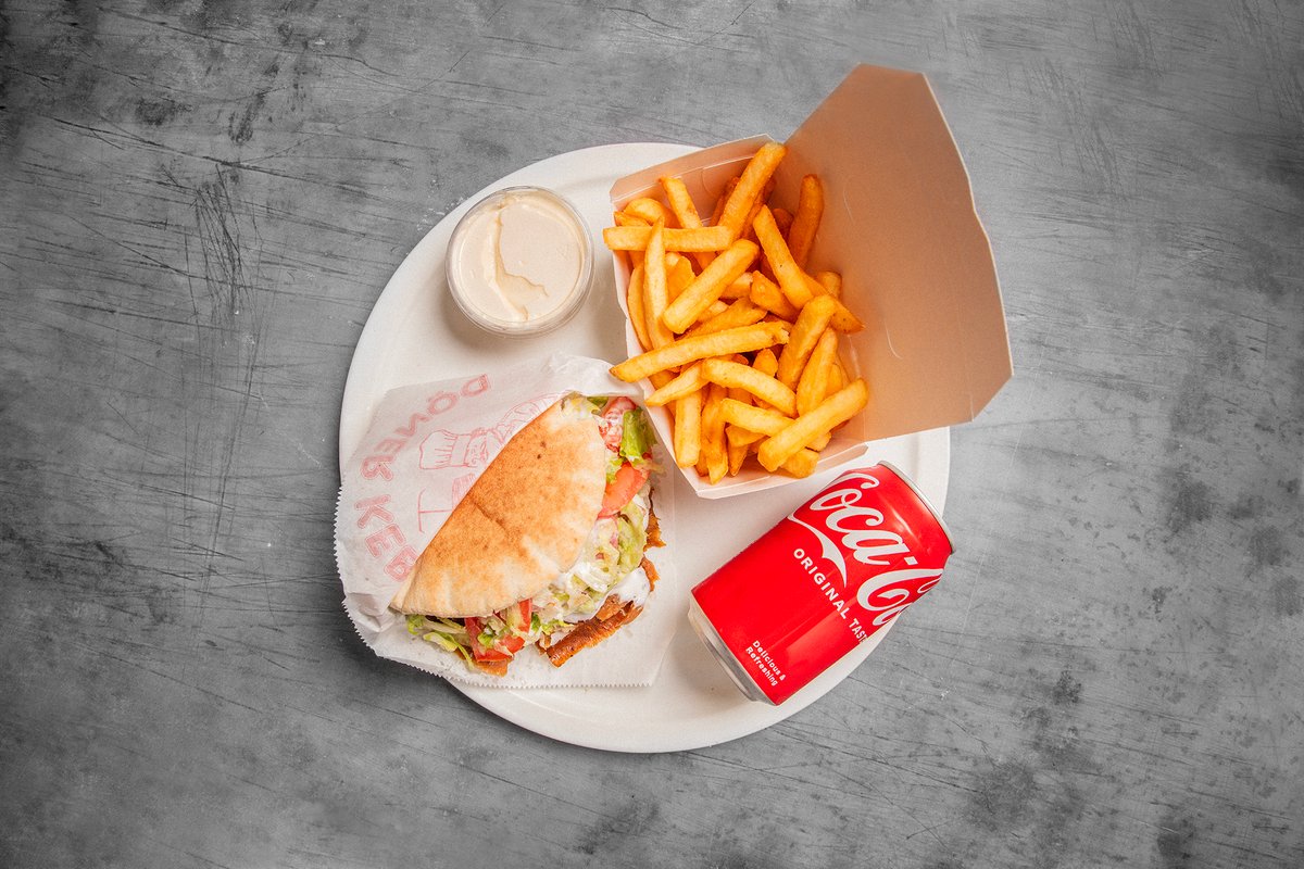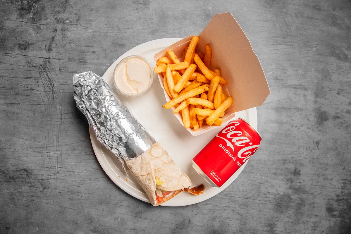 Pita med valgfri protein serveres med pommes frites og dåsesodavand.