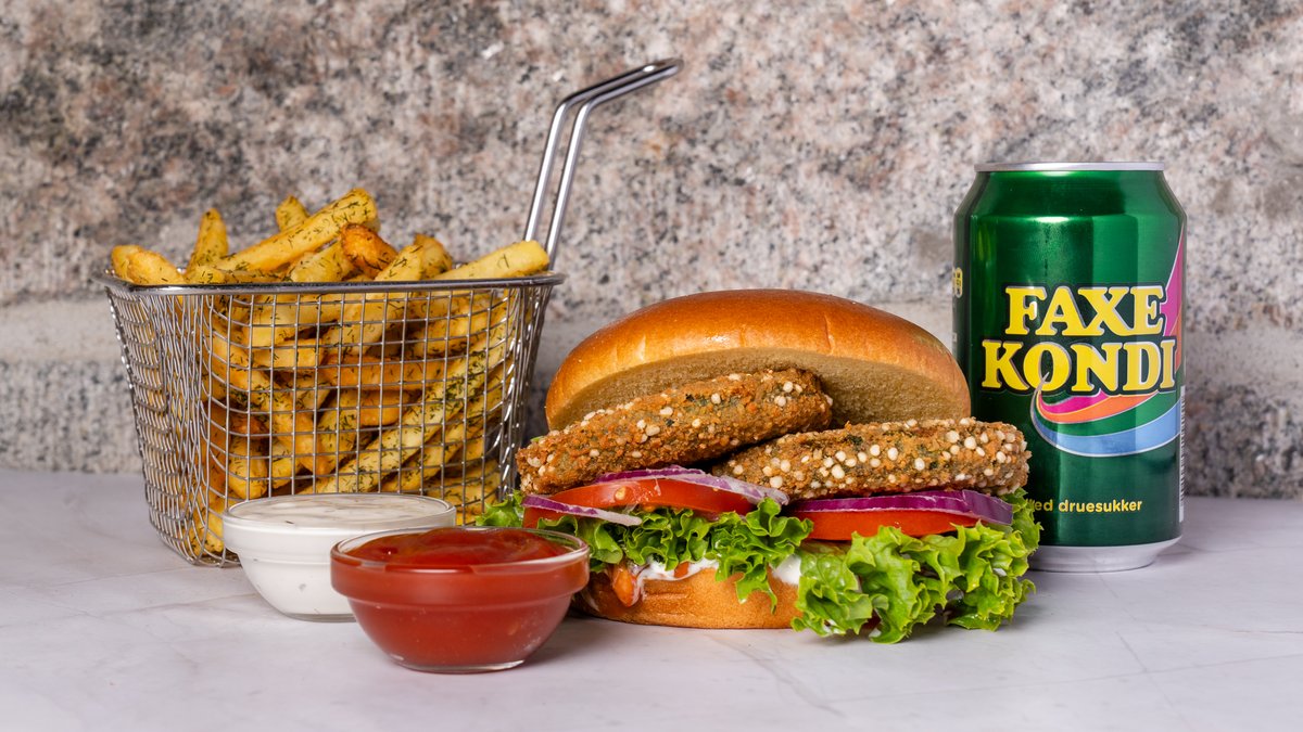 Vegetar burger serveret med pommes frites og valgfri sodavand.