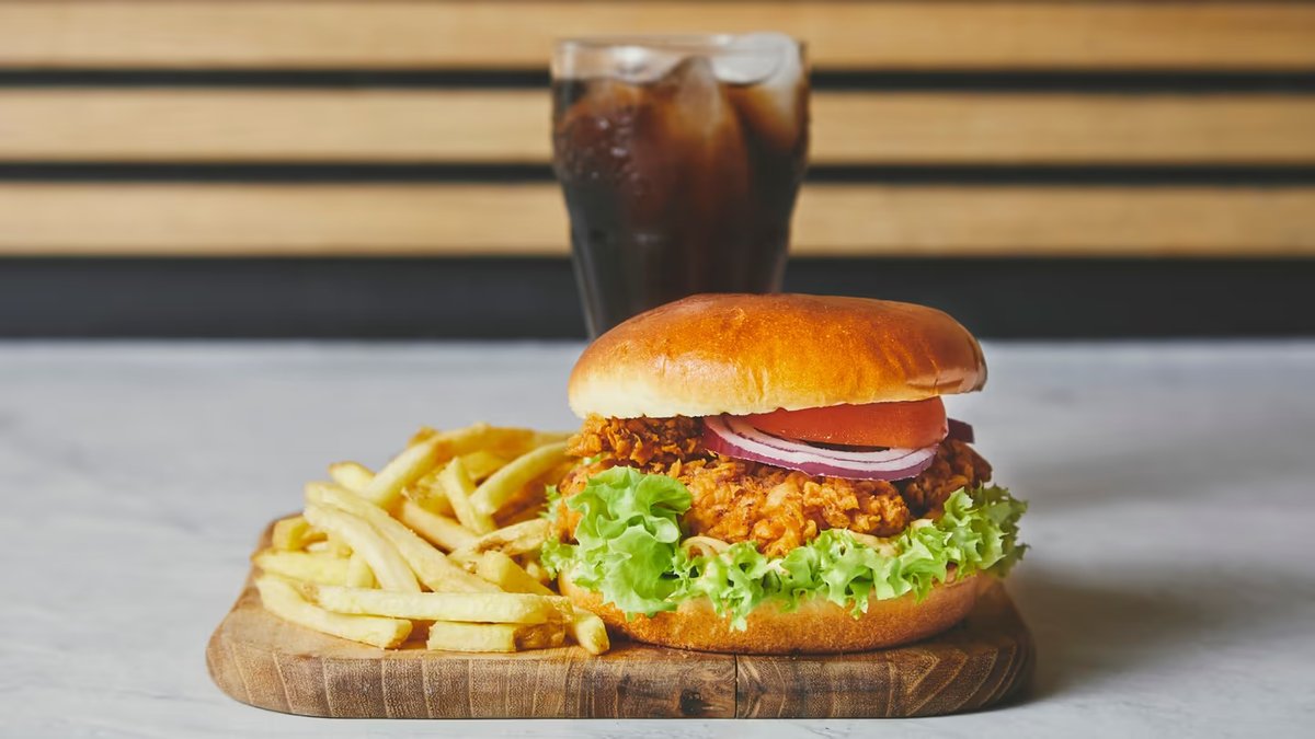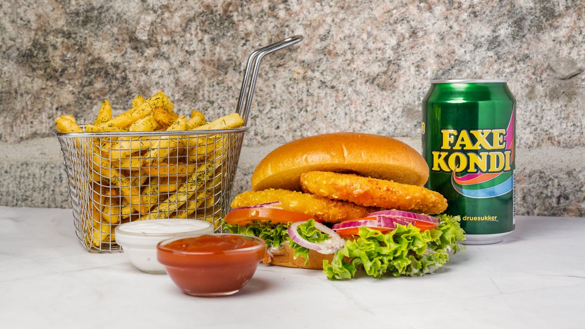 Marineret kyllingefilet burger serveret med pommes frites og valgfri sodavand.