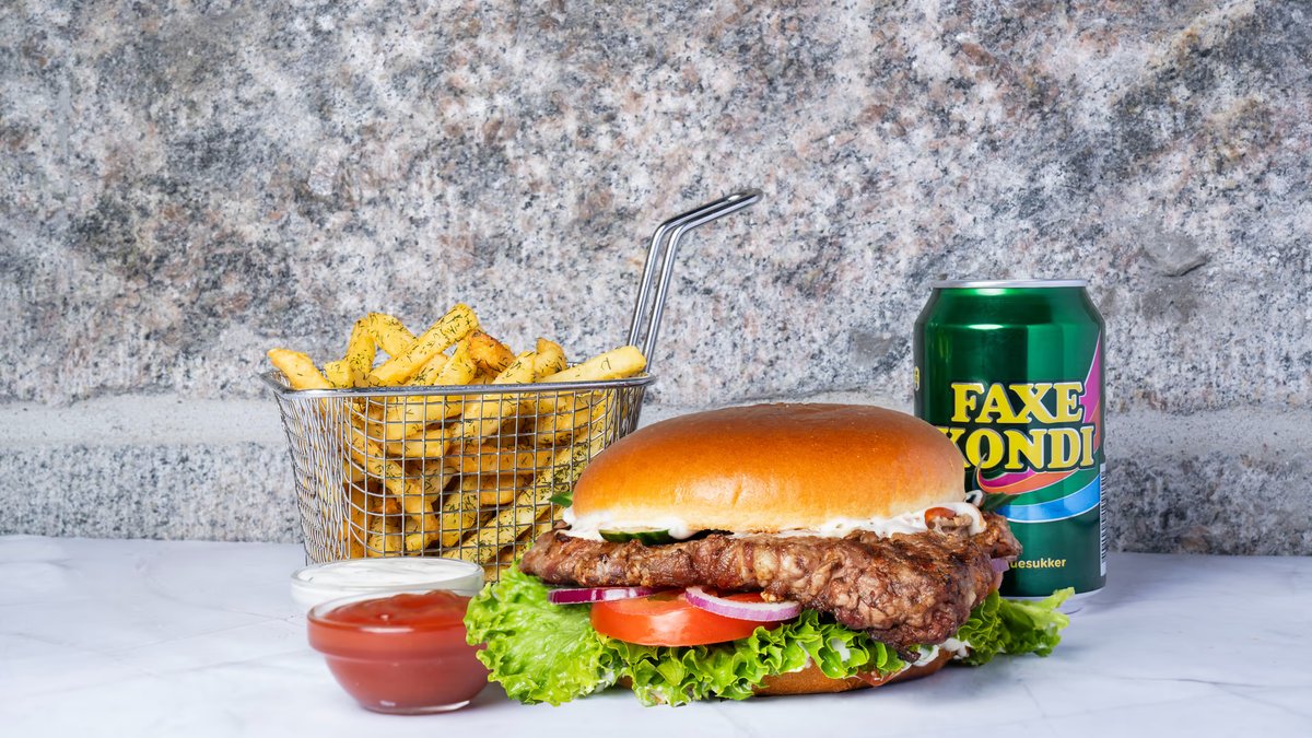 200 gram oksebøf, tomat, ost, mayonnaise, agurk, salat, rødløg og hjemmelavet dressing.