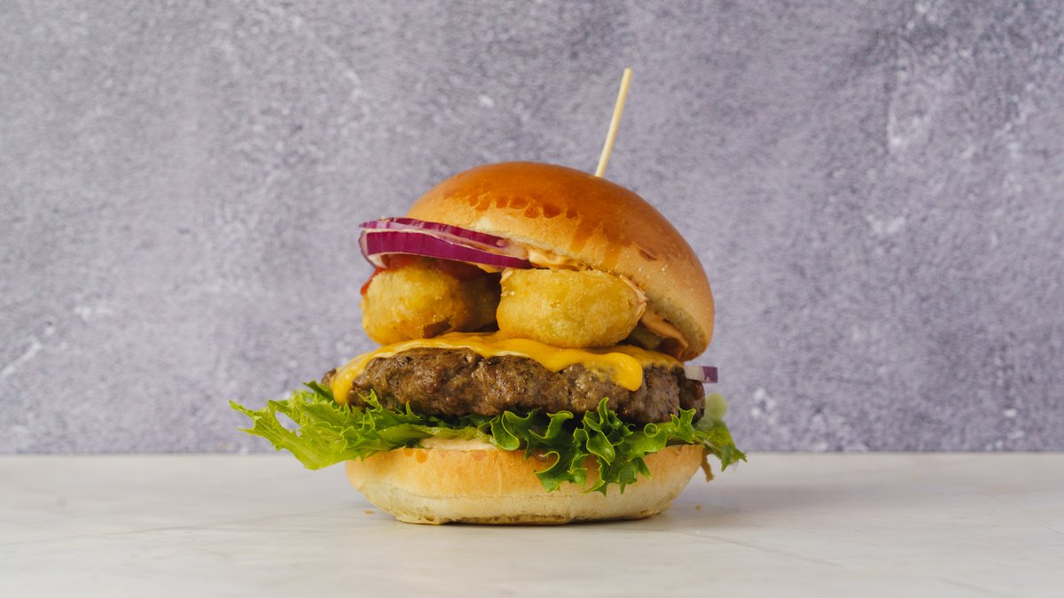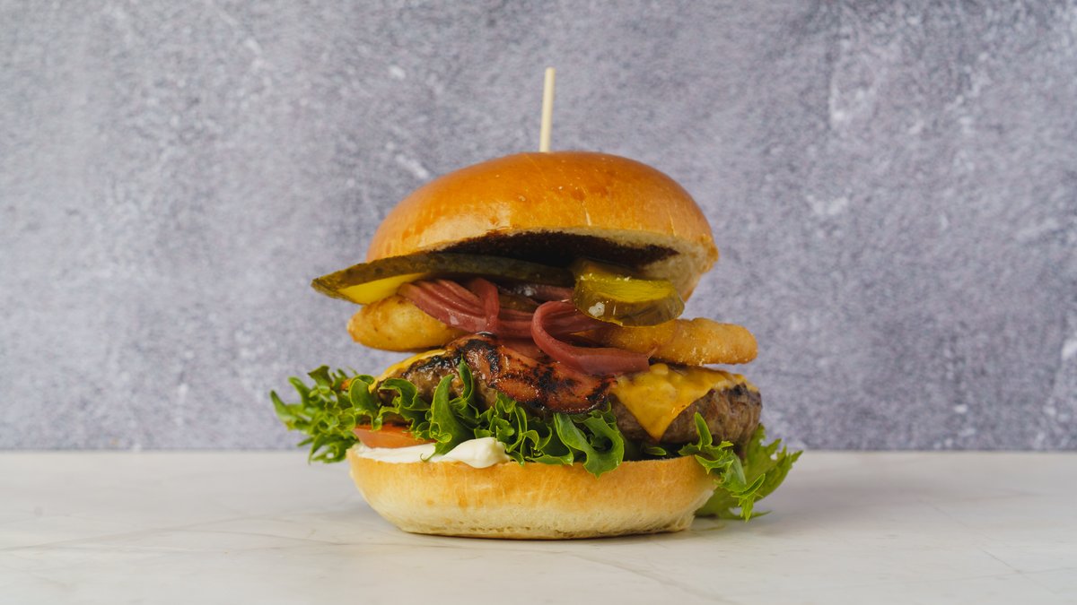 200 gram saftig oksekødsbøf i brioche-bolle med fyld af mayo, barbecue sovs, syltede rødløg, salat, tomat, syltede agurker, cheddar, kalve bacon og løgringe.