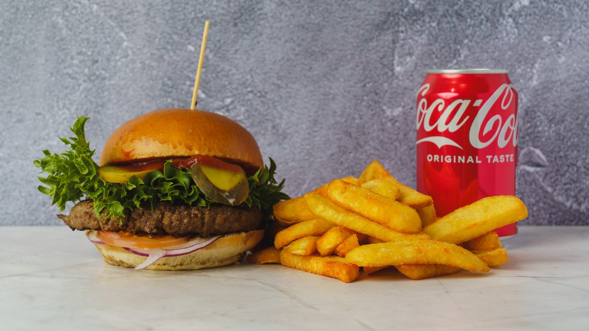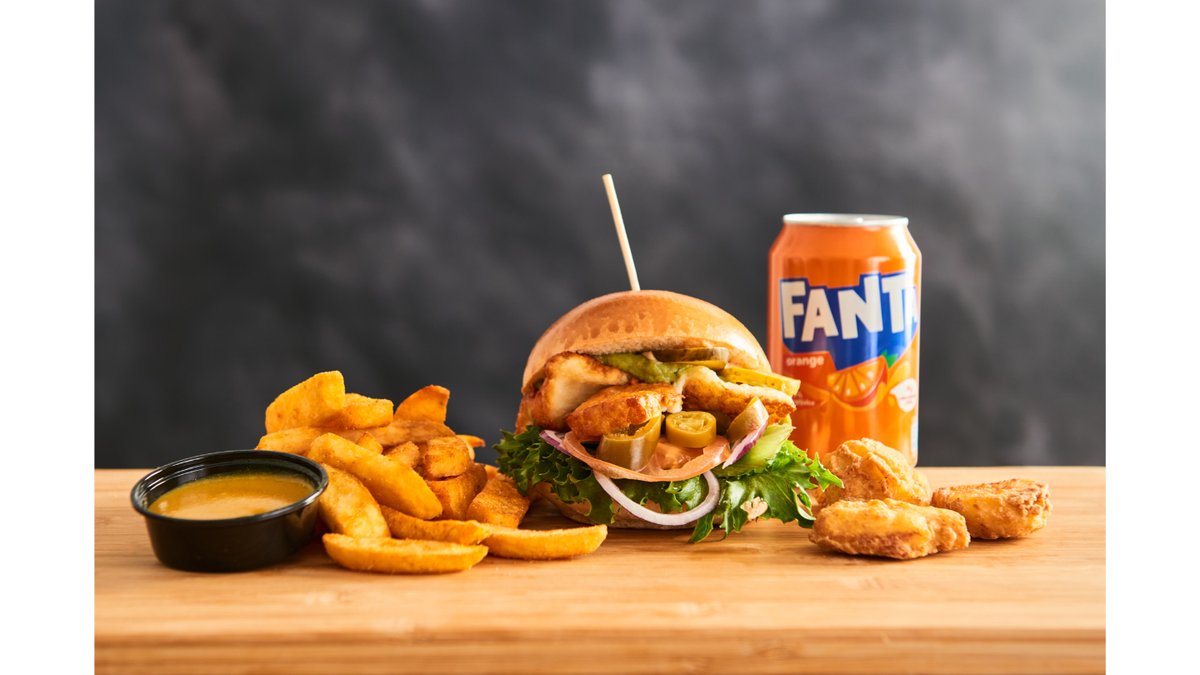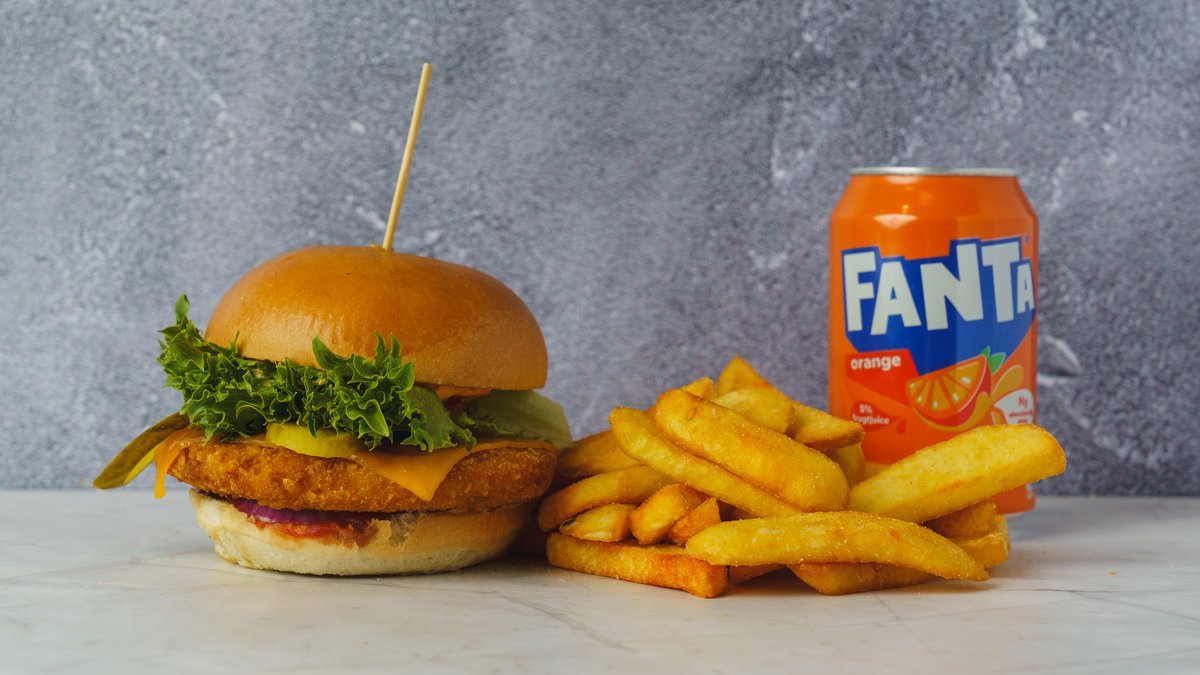 Serveret med pommes frites, 4x gratis mozzarella sticks, en valgfri dip og valgfri drikkevare.