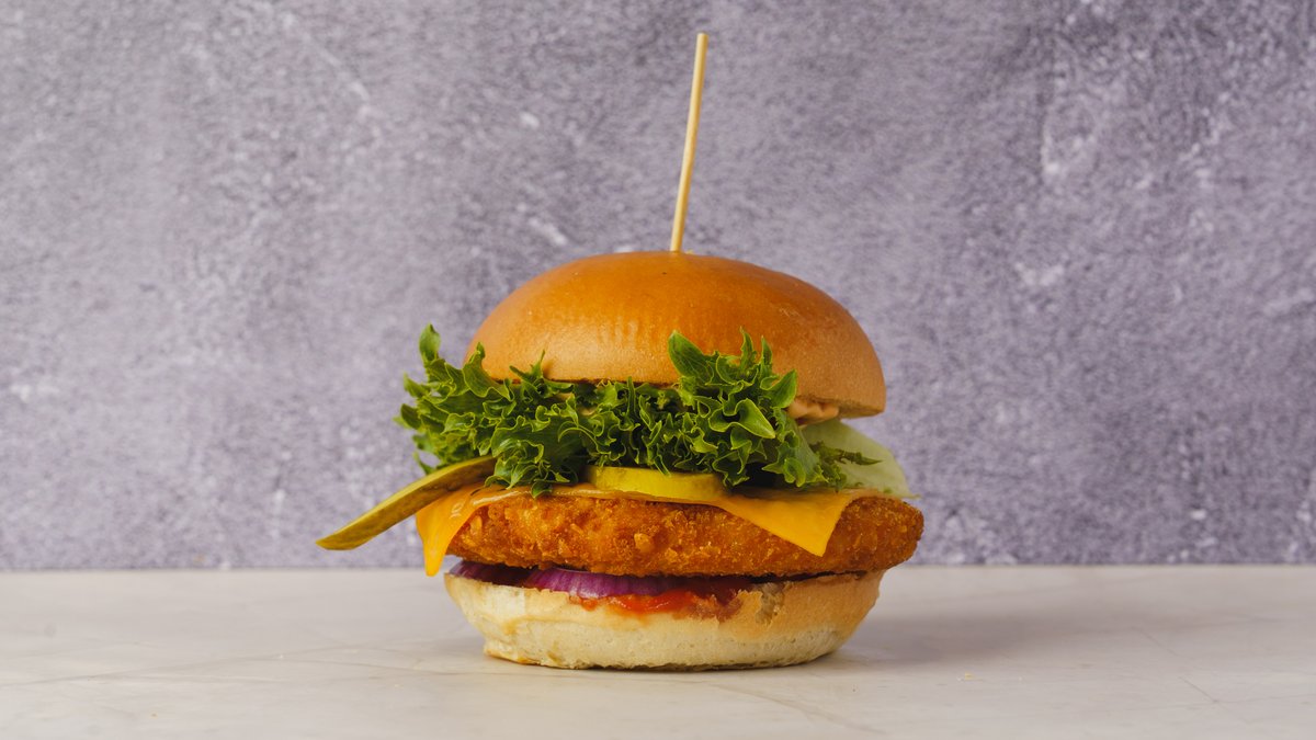 Paneret Crispy kylling i brioche-bolle med fyld af chili mayo, ketchup, rødløg, salat tomat, syltede agurker og cheddar.