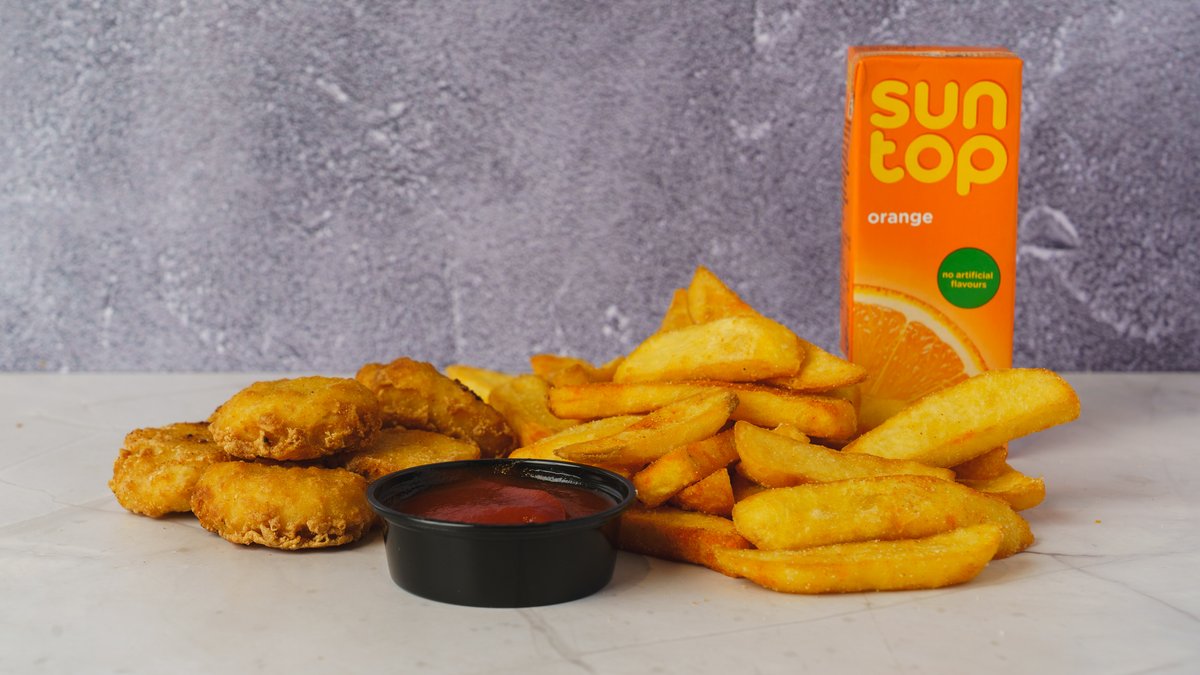 6 nuggets serveres med pommes frites, valgfri dip og juice.