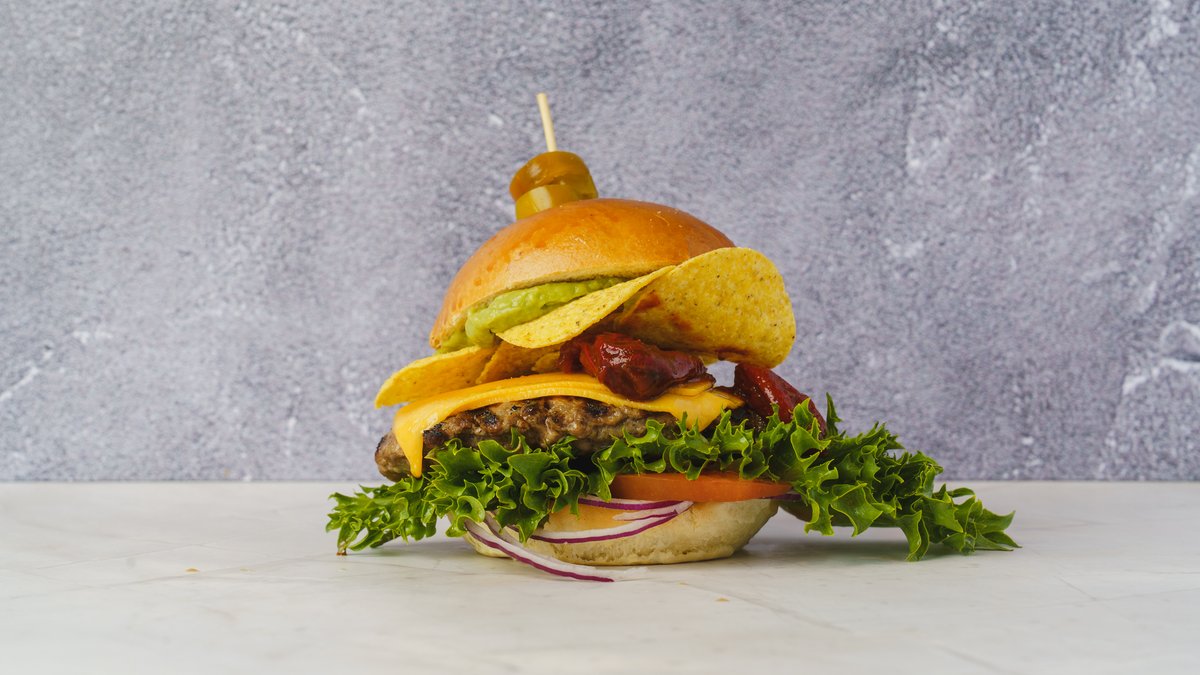 200 gram saftig oksekødsbøf i brioche-bolle med fyld af chipotle mayo, rødløg, salat, tomat, 2 x cheddar, jalapeños, guacamole, chipotle, salsa og nachos.