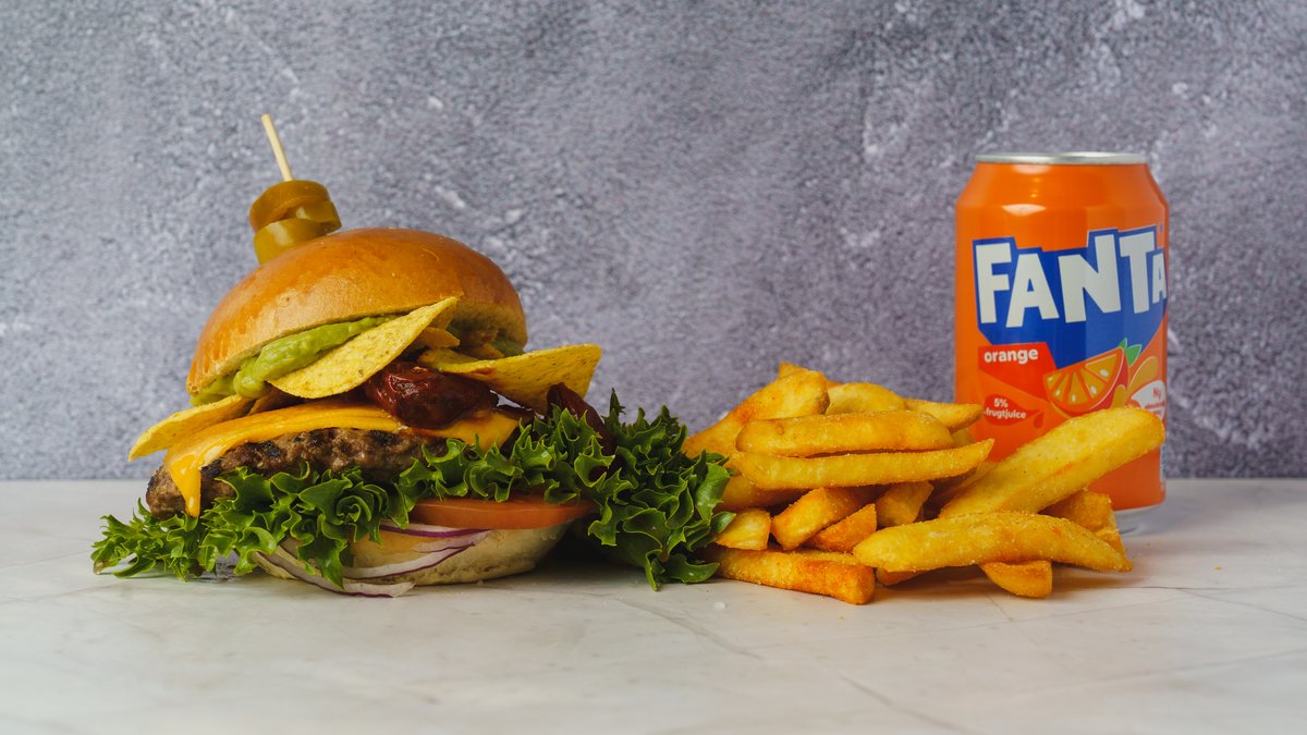 200 gram saftig bøf som består af black Angus fra Uruguay og waguy fra Australien i en brioche-bolle med fyld af chipotle mayo, rødløg, salat, tomat, 2 x cheddar, jalapeños, guacamole, chipotle, salsa og nachos. Serveret med pommes frites, Dip og valgfri drikkevare.