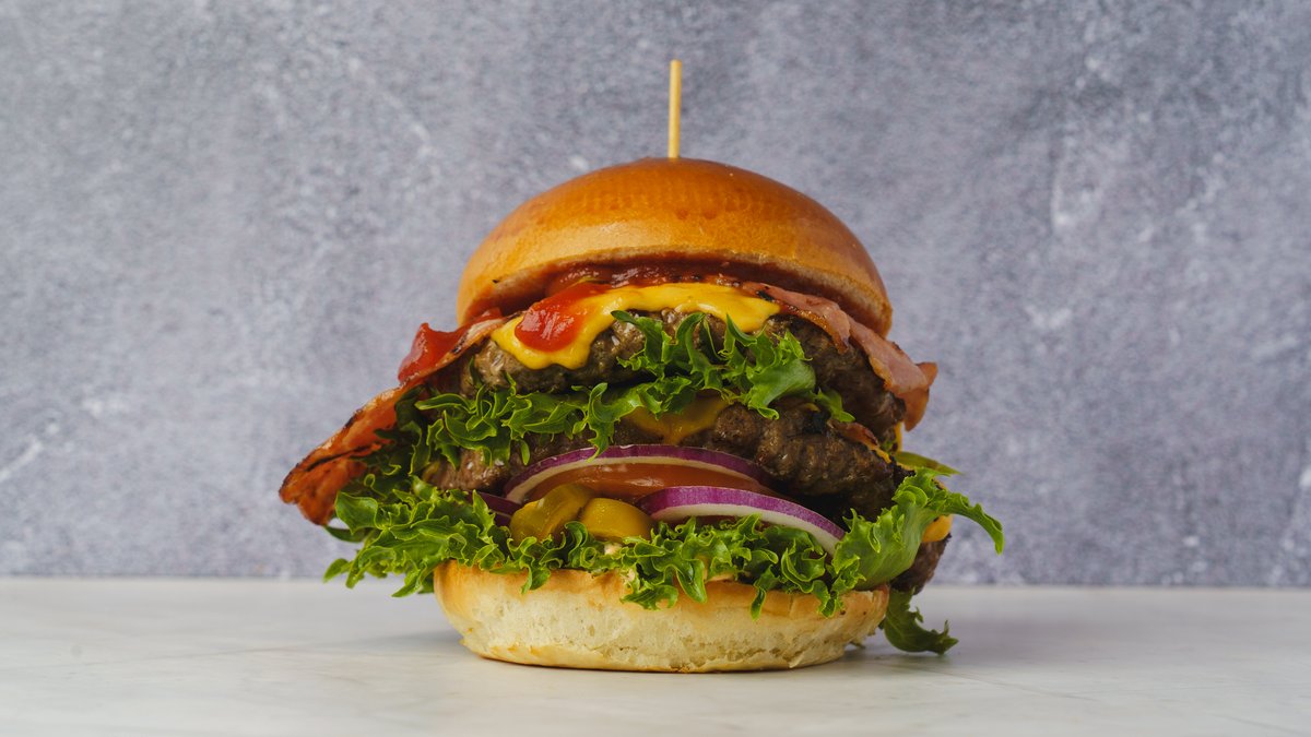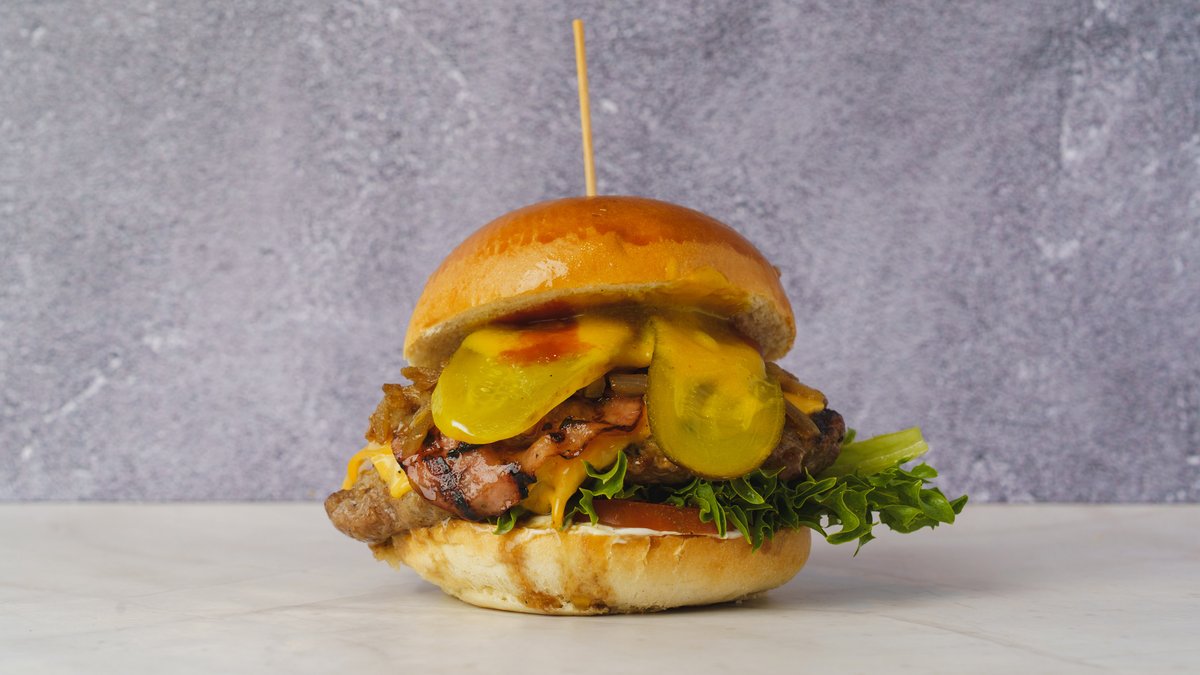 200 gram saftig oksekødsbøf i brioche-bolle med fyld af mayo, ketchup, sød sennep, karamelliserede løg, salat, tomat, syltede agurker, 2 x cheddar og kalve bacon.