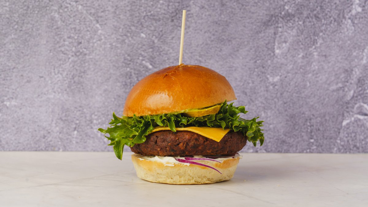 Vegetarisk bøf i brioche-bolle med fyld af mayo, rødløg, salat, tomat, syltede agurker, cheddar og guacamole.
