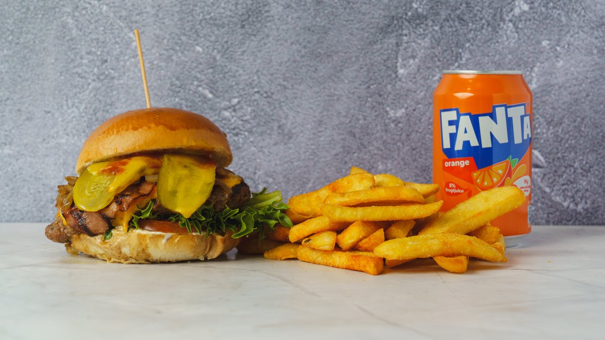 200 gram saftig bøf som består af black Angus fra Uruguay og waguy fra Australien i en brioche-bolle med fyld af mayo, ketchup, sød sennep, karamelliserede løg, salat, tomat, syltede agurker, 2 x cheddar og kalve bacon. Serveret med pommes frites, Dip og valgfri drikkevare.