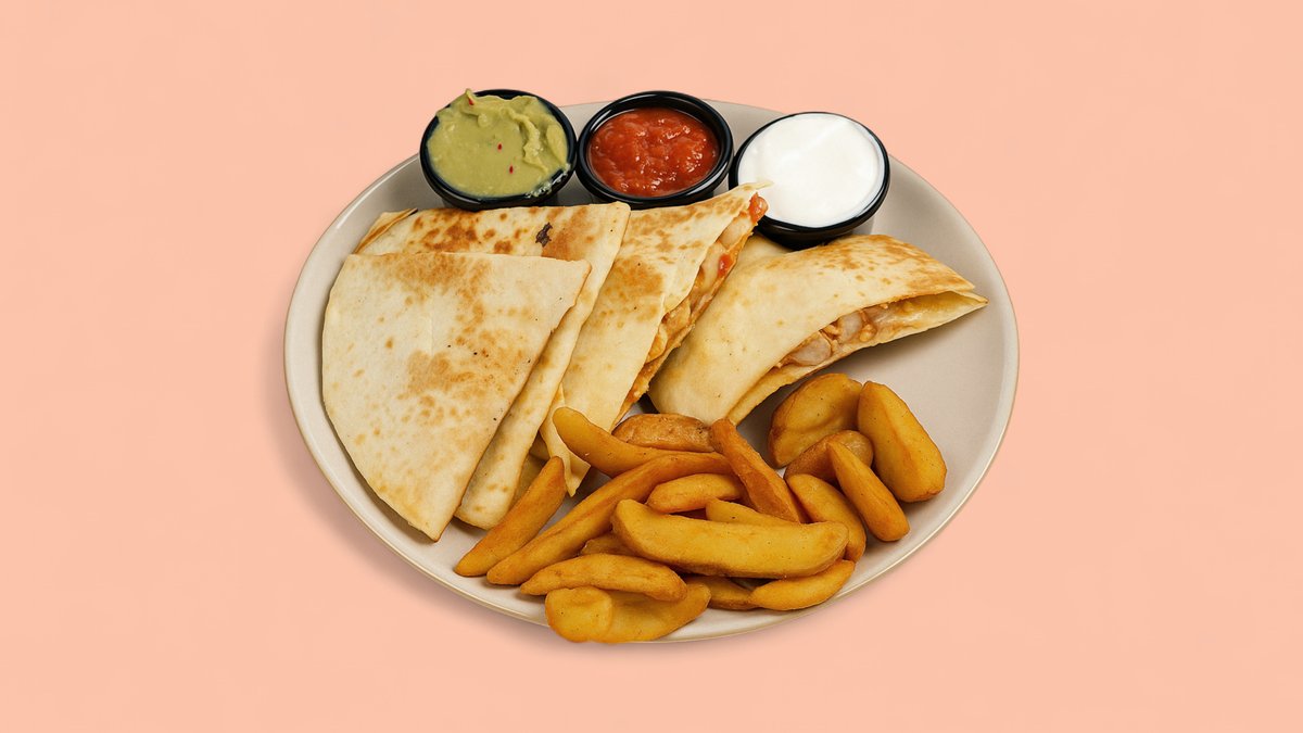 Tortilla med fyld af krydret kylling, smeltet ost, peberfrugt, tomat og rødløg. Serveres med salsa, guacamole og creme fraiche.