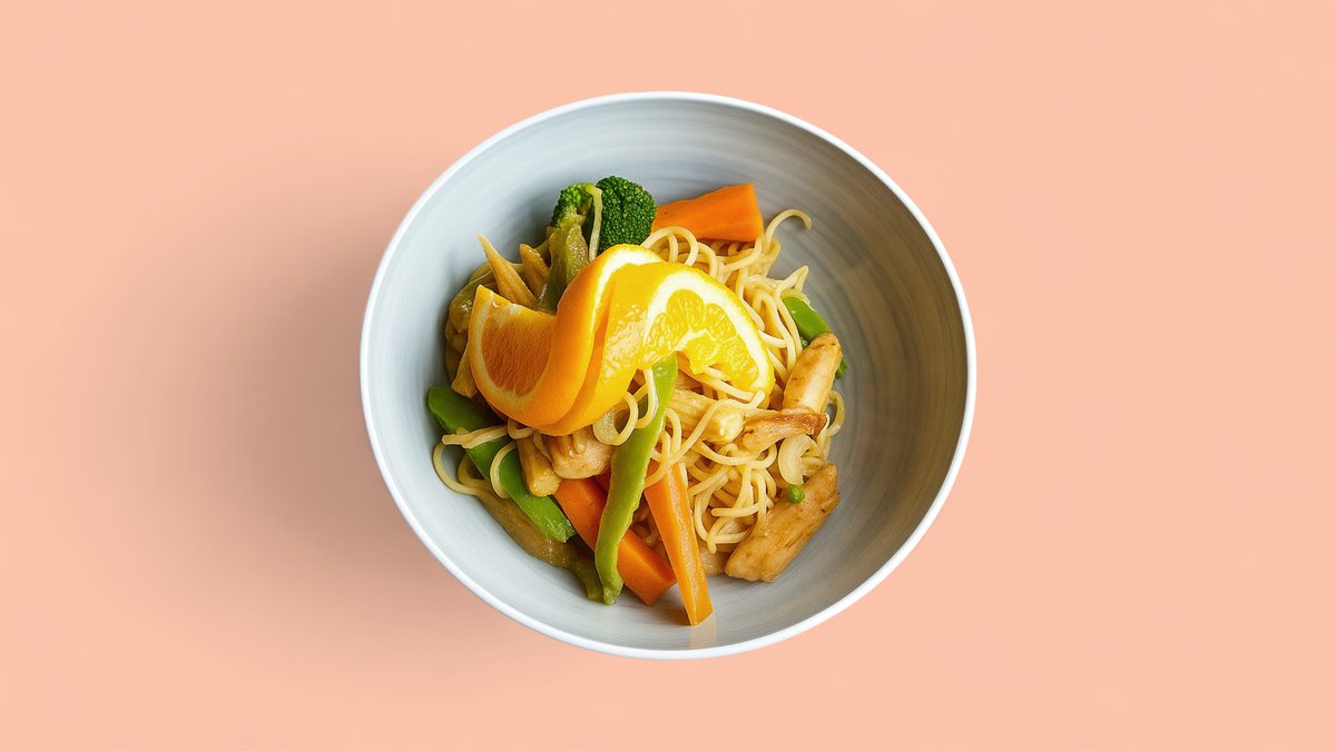 Thai-inspireret wok med nudler, kylling, blandede grøntsager, cashewnødder og woksauce.