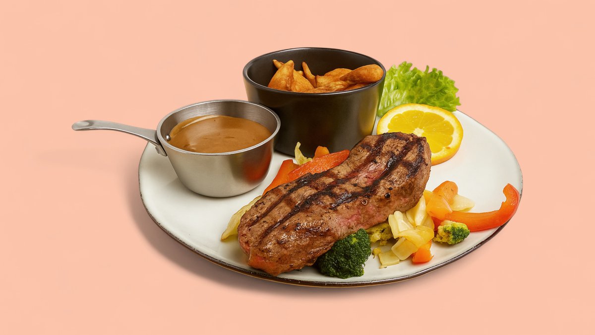 Grillet steak af oksefilet, serveret med trøffel flødekartofler, garniture og valgfri sauce.