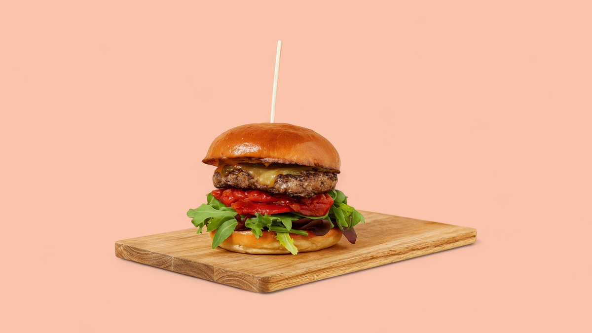 Briochebolle med fyld af grillet bøf, cheddar, bacon, vores signaturrelish, blandet salat, rødløg, cherrytomater og mayo. Serveres med kartoffelbåde og chilimayonnaise.
