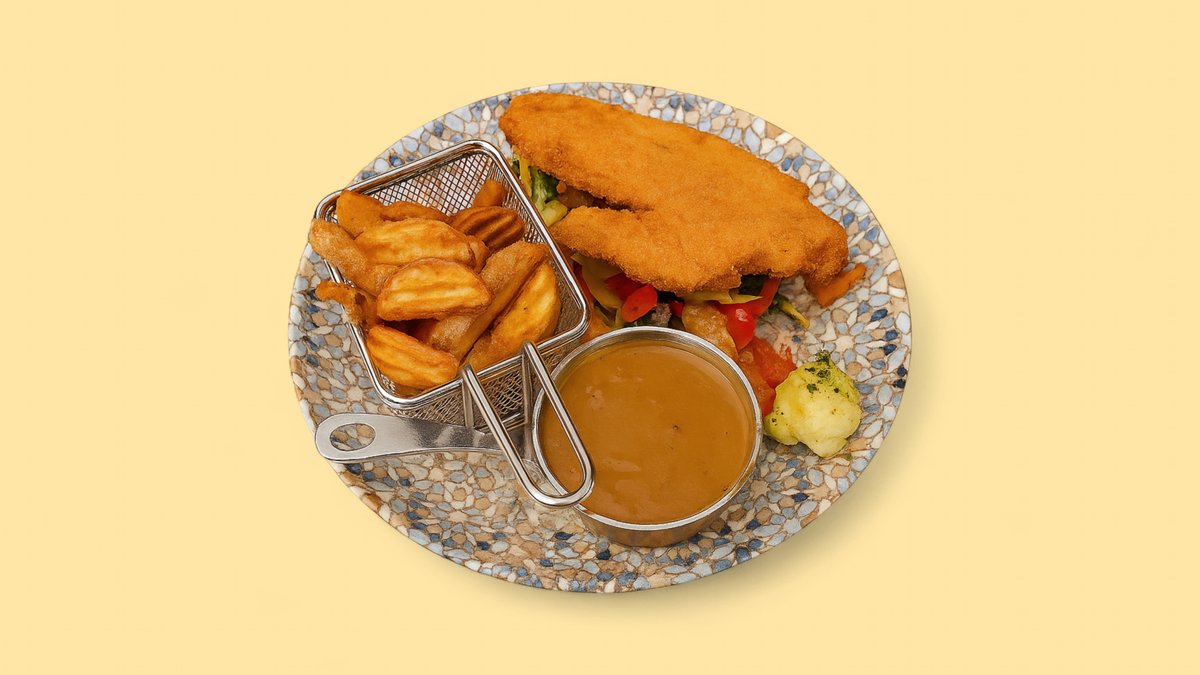 Paneret rødspættefilet serveret med pommes frites og remoulade.