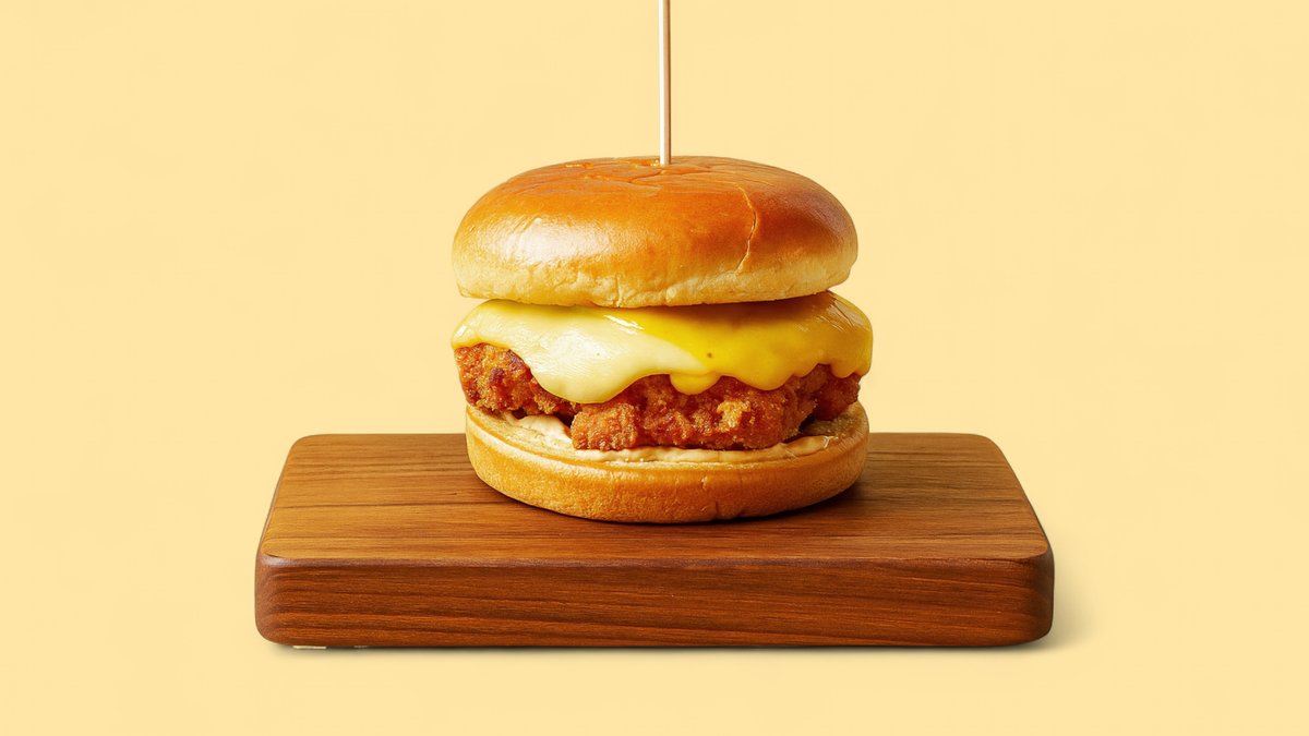 Briochebolle med fyld af paneret vegetarisk kyllingebøf, cheddar, blandet salat, mayo og maple sriracha sauce. Serveres med kartoffelbåde og chilimayonnaise.