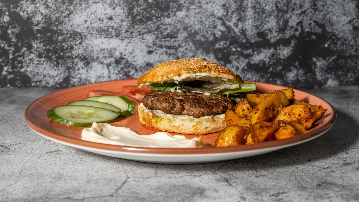 Valgfri protein i burgerbolle med tomat, agurk, og mayonnaise. Serveres med ovnbagte kartofler.