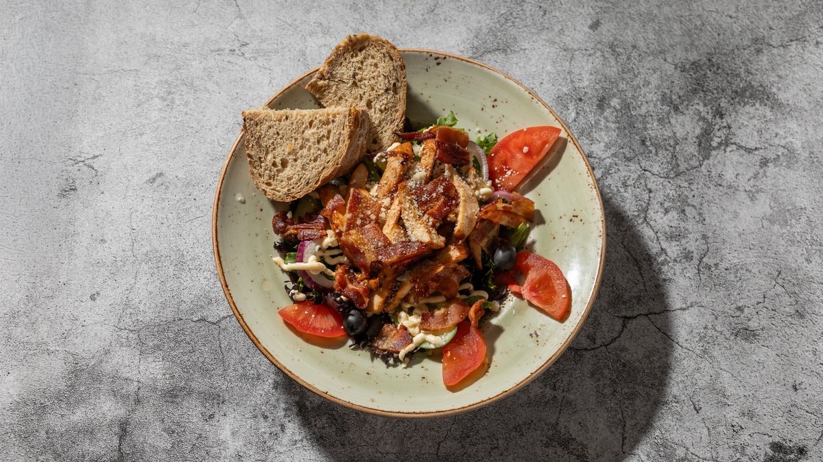 Grillet kylling med bacon, dressing og parmesan. Serveres med brød og smør.