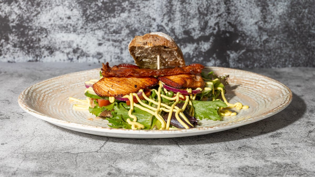Ciabattabrød med fyld af kylling, bacon, salat, tomat, agurk, rødløg, karrydressing og mayo.
