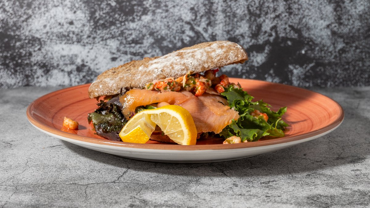 Ciabattabrød med fyld af røget laks, marinerede krebsehaler, salat, tomat, rødløg og pestodressing.