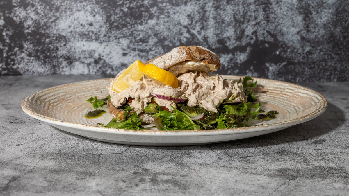 Ciabattabrød med fyld af tunmousse, salat, tomat, agurk, rødløg, pestodressing og mayo.