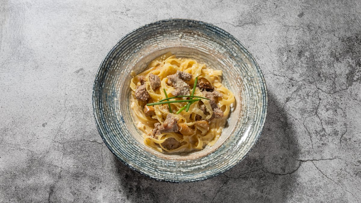 Fettuccine pasta med stykker af mørbrad, vendt i en cremet svampesauce. Toppet med parmesan.