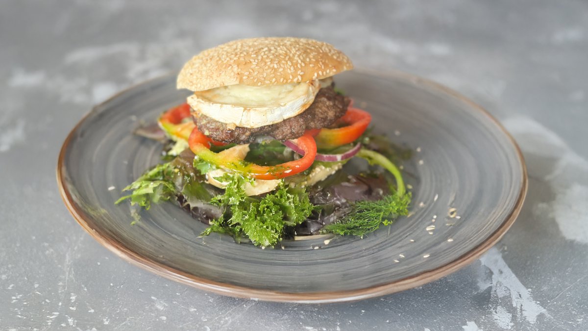 Bøf af okse i burgerbolle med gedeost, salat, peberfrugt, rødløg, mayo og pestodressing.