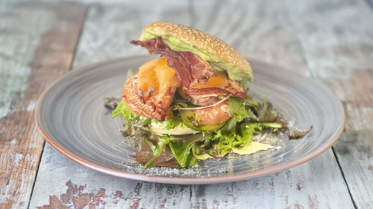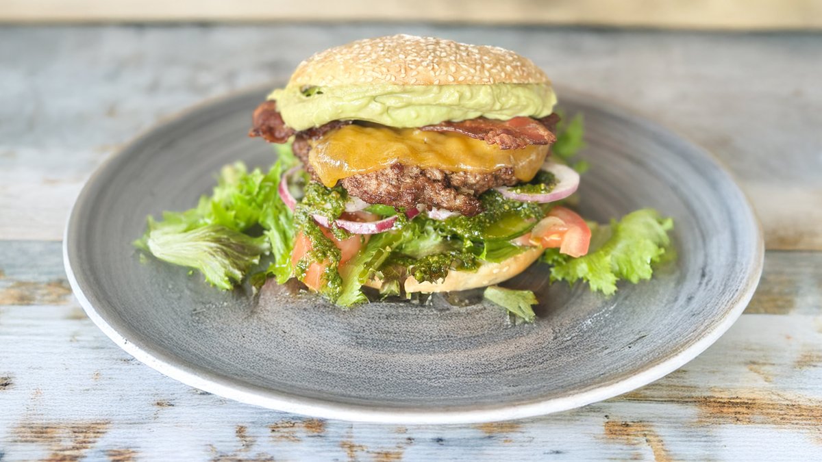 Bøf af okse i burgerbolle med cheddar, bacon, salat, agurk, tomat, rødløg, mayonnaise, guacamole og pestodressing.