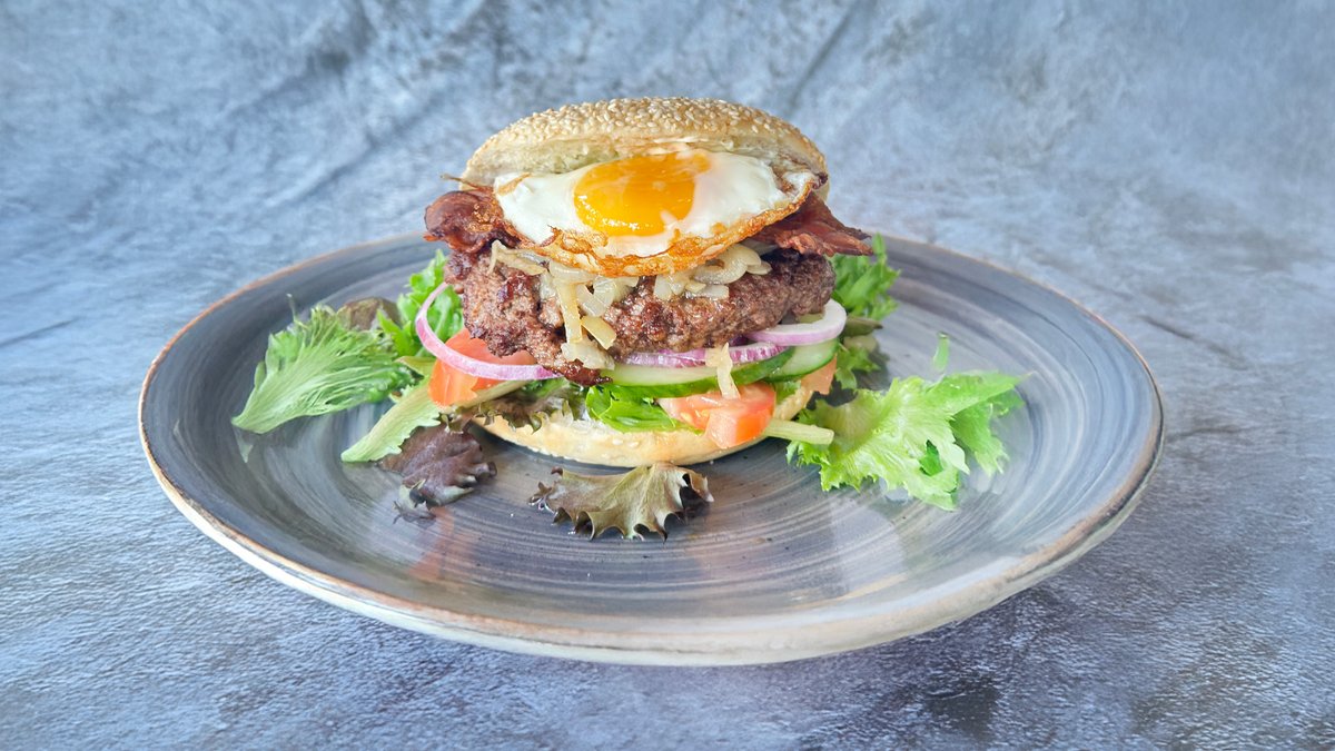 Bøf af okse i burgerbolle med spejlæg, bacon, bløde løg, salat, agurk, tomat, rødløg og mayonnaise.