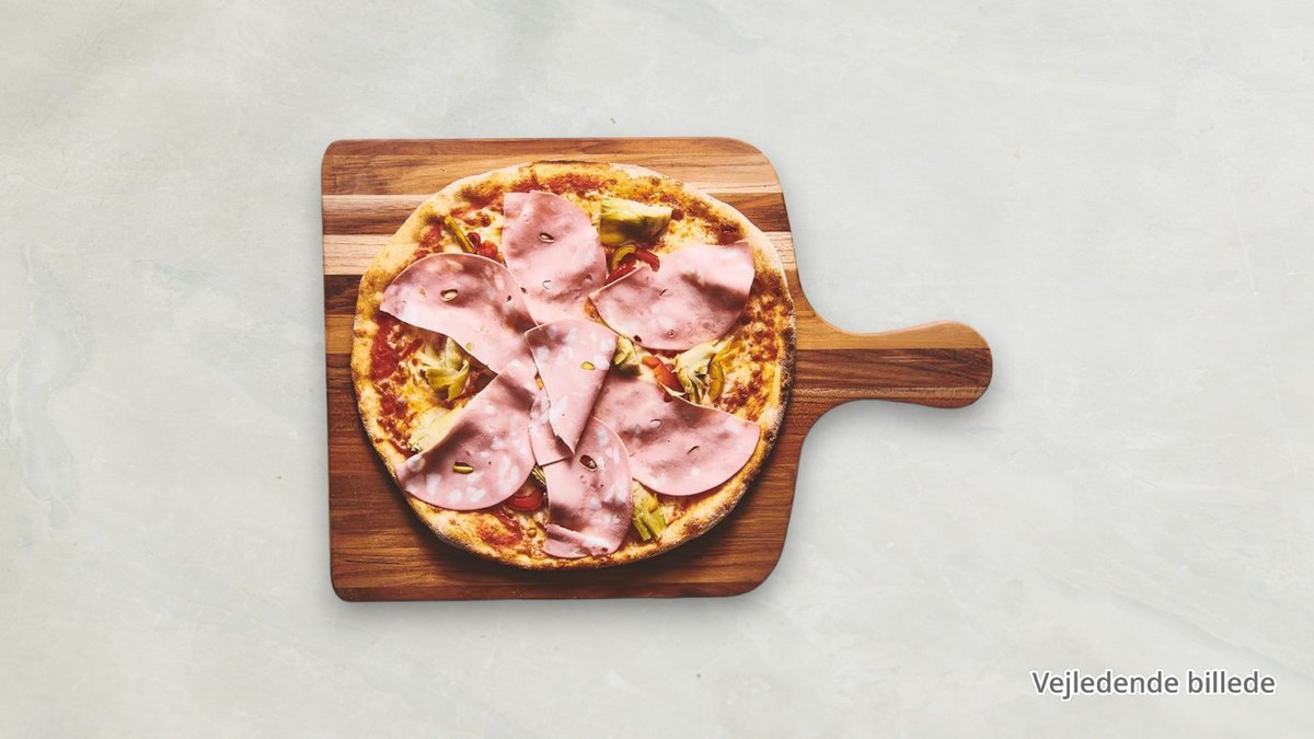 Tomat, ost, skinke, champignon, artiskok og rejer.