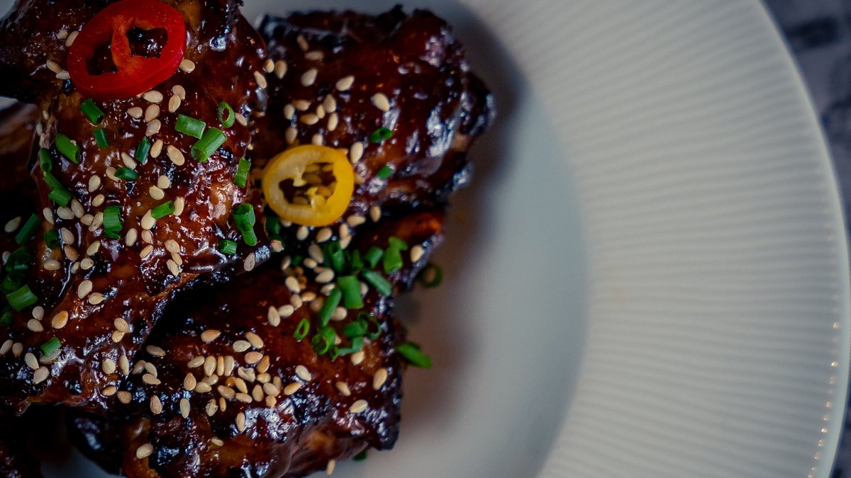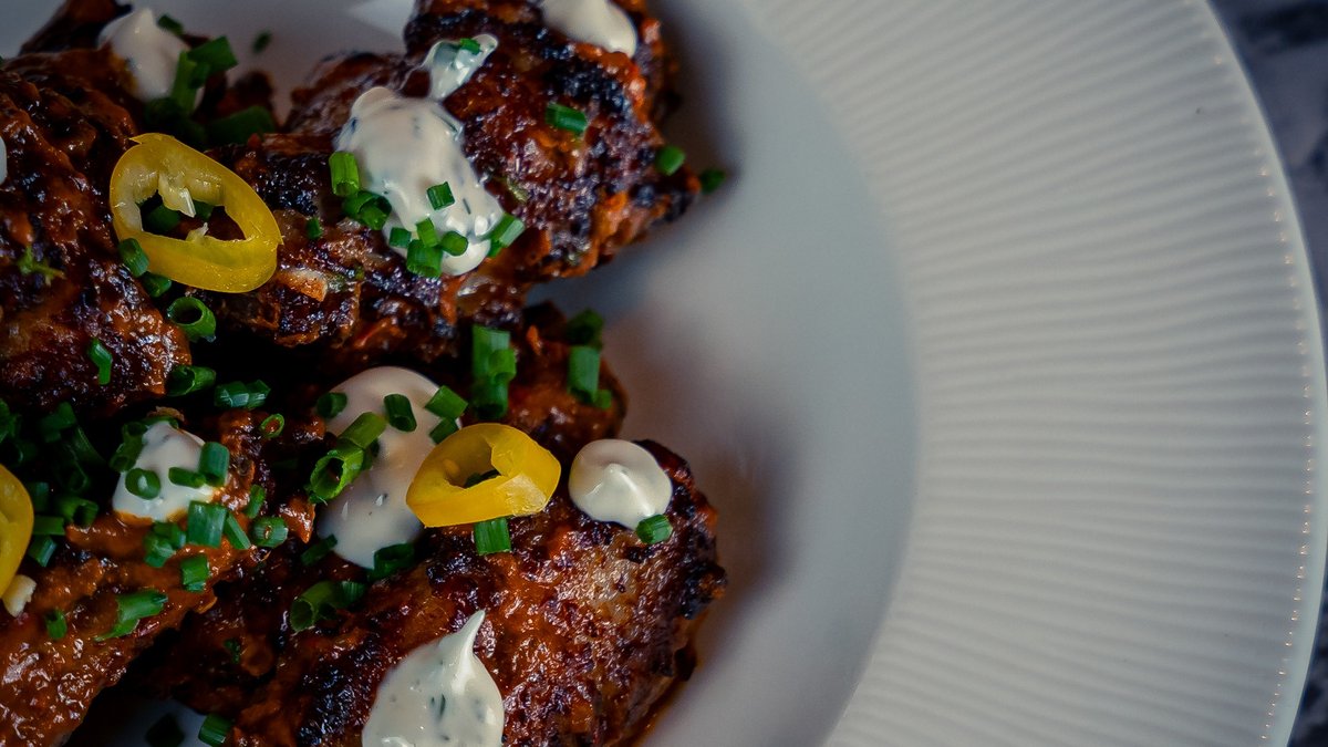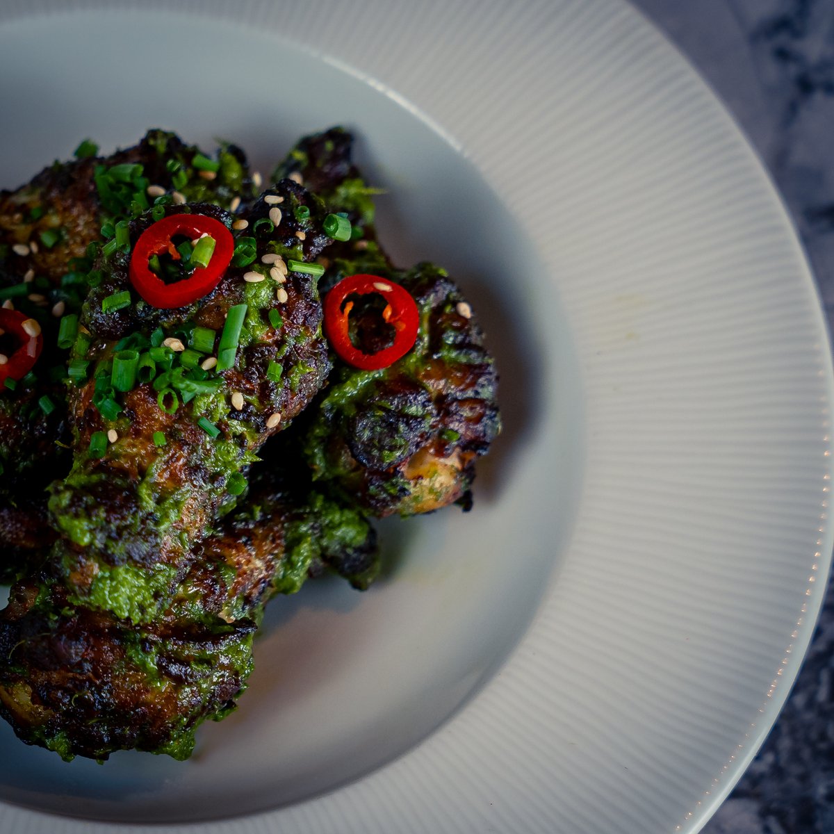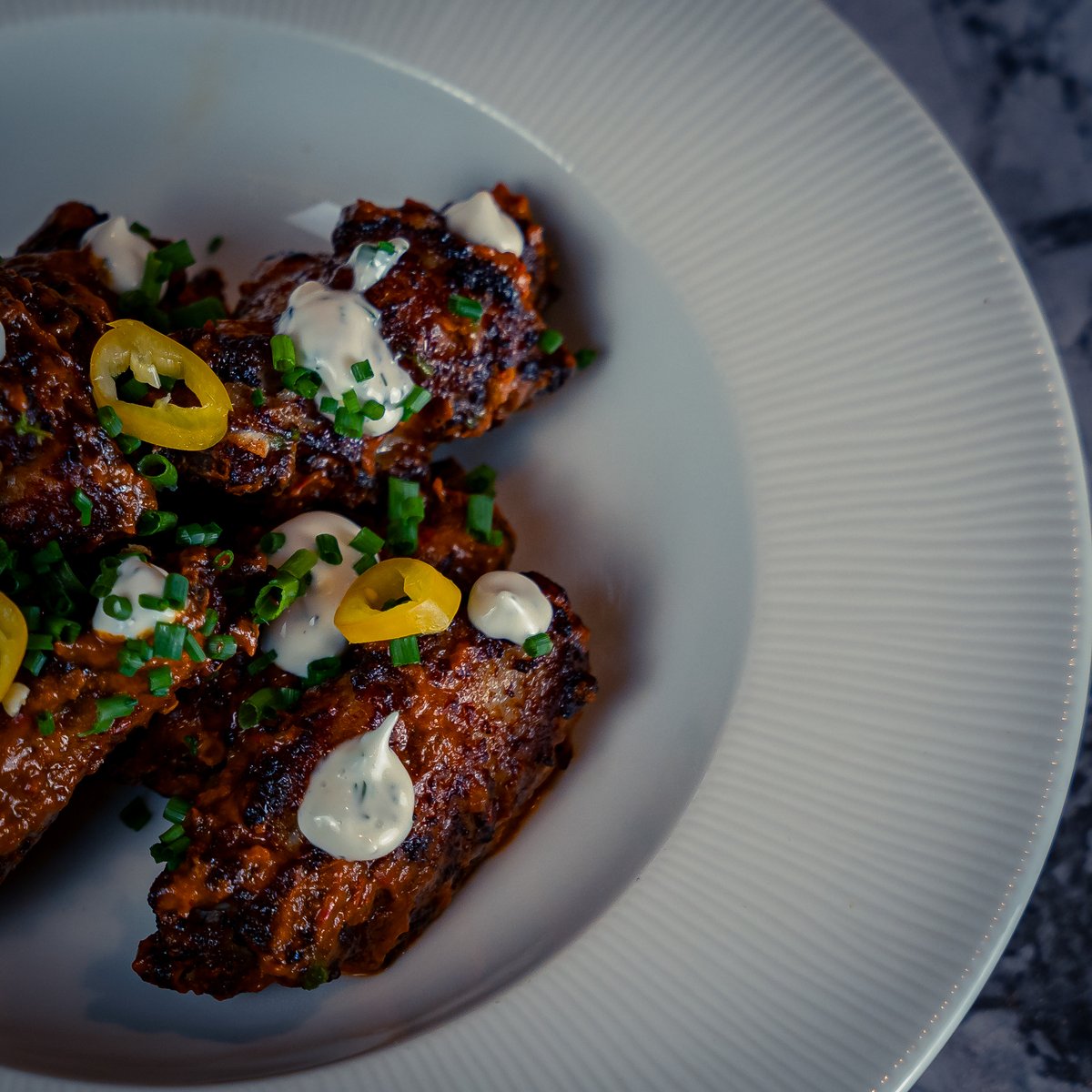 Smoked chicken wings topped with spicy bbq sauce, sesame, chili, herbs and ranch dressing.