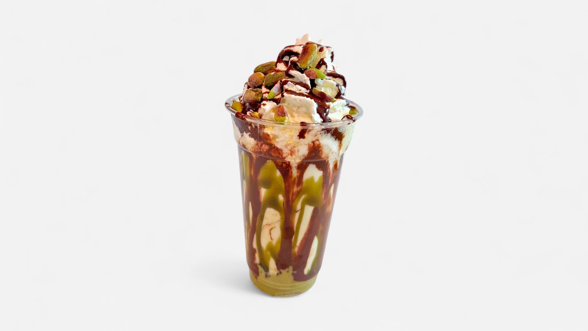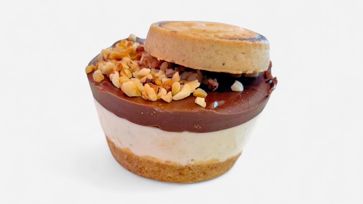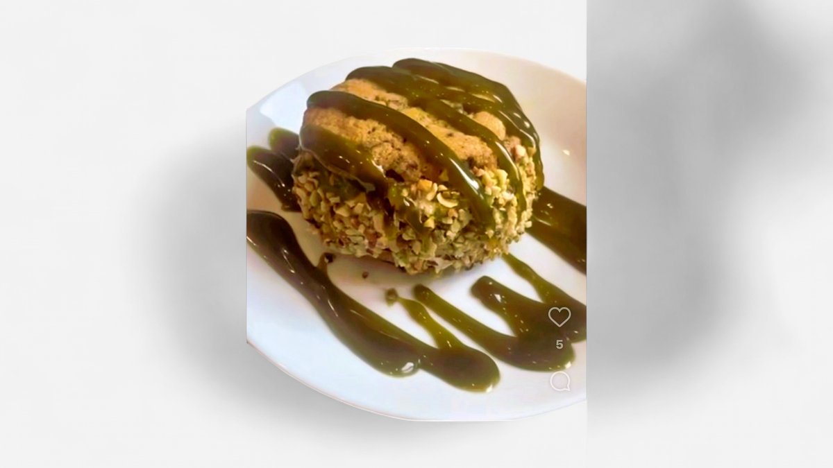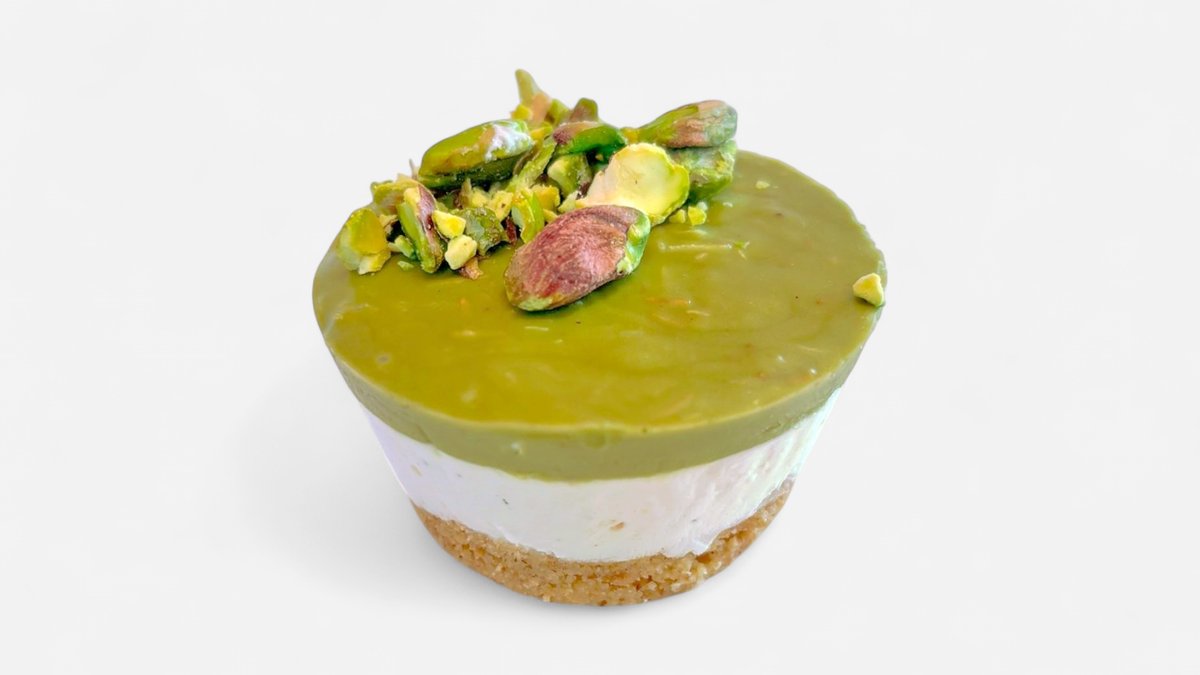Cookie med pistaciecreme, mørk chokoladeovertræk og hele pistacienødder.