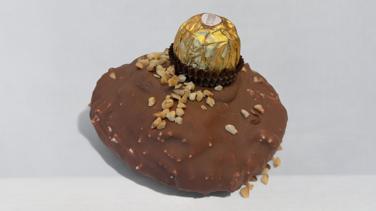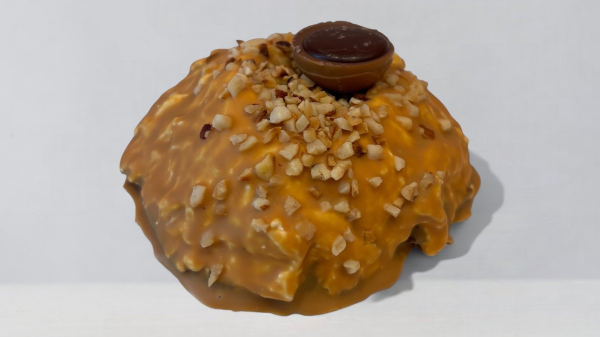 Cookie med hasselnøddecreme toppet med hvid chokolade og nødder.