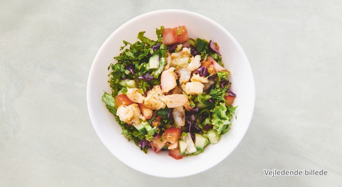 Valgfri protein, icebergsalat, tomat, agurk og hjemmelavet dressing