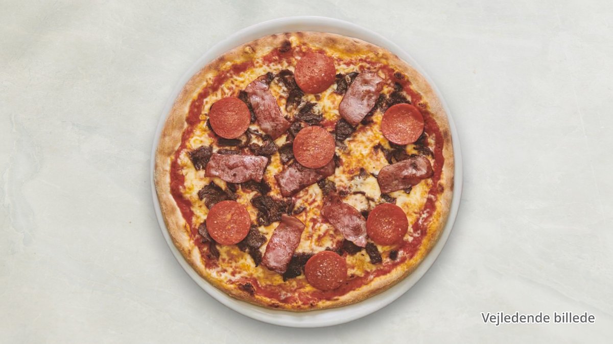 Tomat, ost, kødstrimler, bacon, løg, paprika.