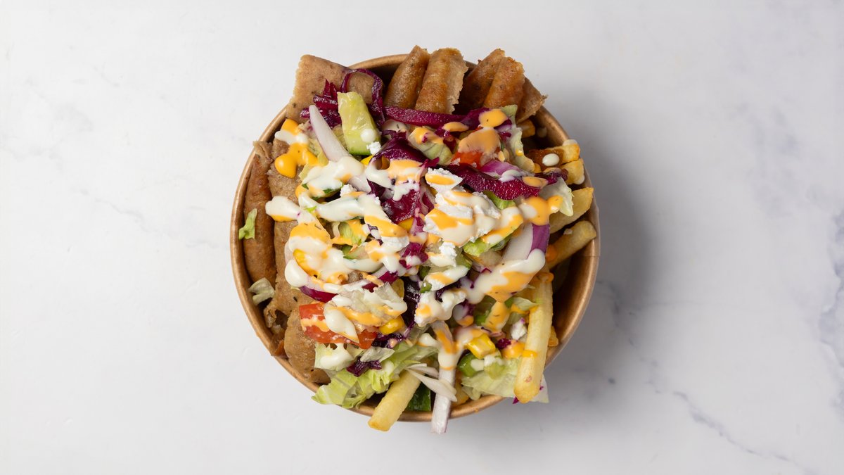 Valgfri bund toppet med valgfri protein, salat, salatmix, majs, feta, løg, rødkål, jalapenos og valgfri sauce.