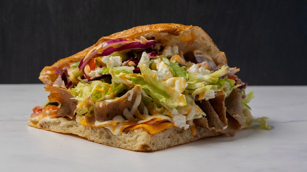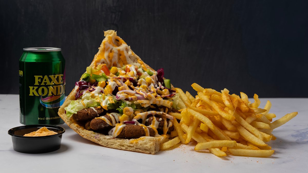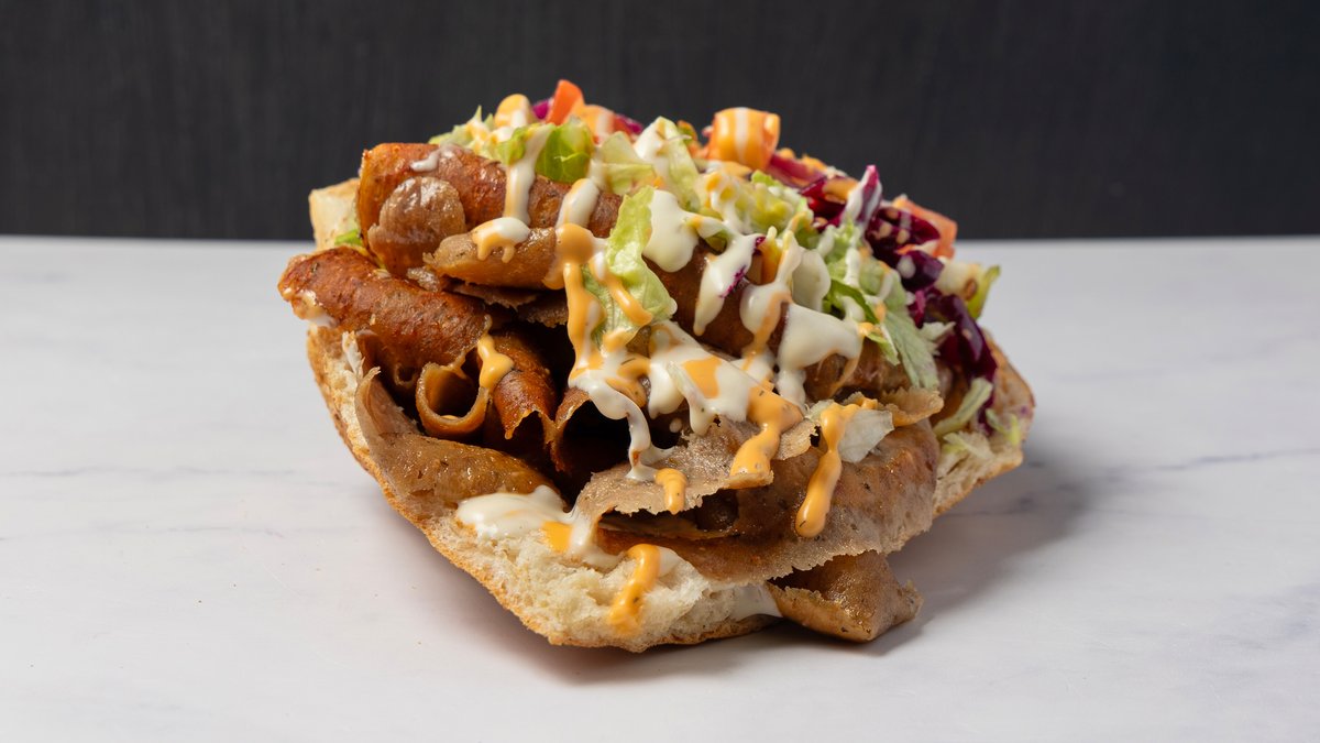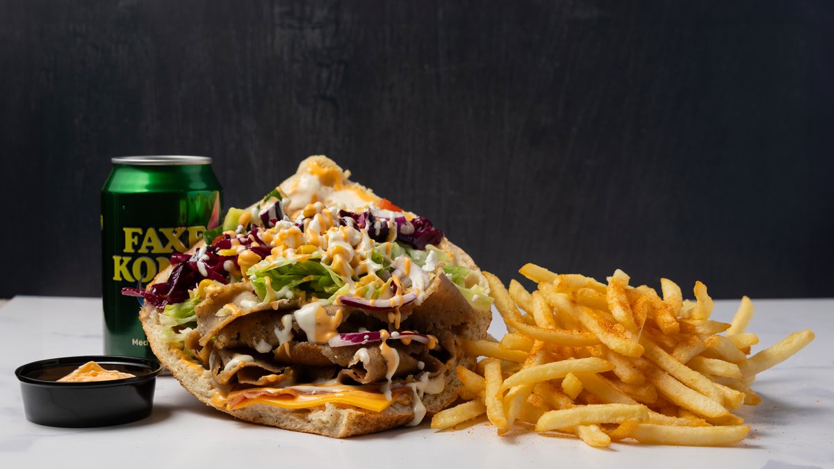 Klassik berliner brød med fyld af valgfri protein, salat, salatmix, majs, feta, rødkål, løg, jalapenos og valgfri sauce. Serveres med pommes frites, en valgfri dip og en valgfri 0,33 l sodavand.