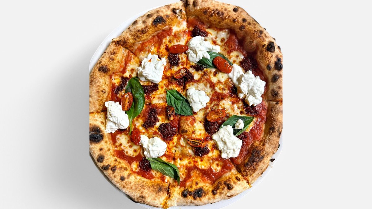 Tomato sauce, Mozzarella, nduja, Stracciatella, semi-dried cherry tomatoes, fresh basil, rosemary oil