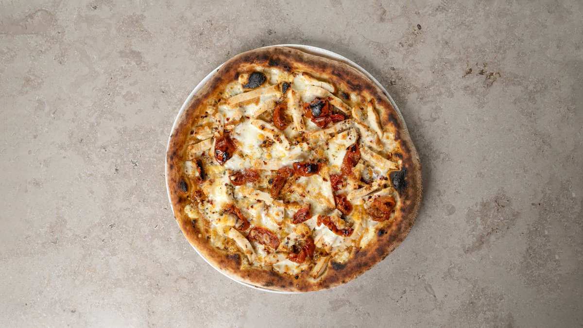 Kylling, mozzarella, semitørrede tomater, Grana Padano, hvidløgsolie, chiliflager & oregano.
