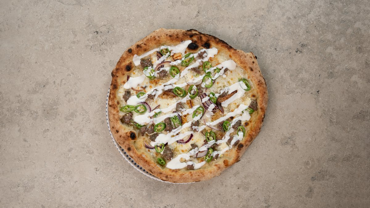 Tomatsauce, mozzarella, løg, oregano, krydret Ventricina & mascarpone. Toppet m. frisk basilikum.
